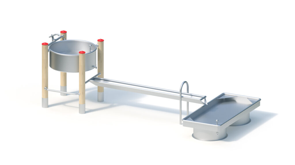 Verschweißte Edelstahlkonstruktion. Blechdicke: min. 2 mm / Rohr Ø 38 mm. Mit 1 Anbindung an Standpfosten, stufenlose Neigung zum Einbau für das erforderliche Gefälle für den Zu- und Ablauf des Wassers durch zusätzliche Aufständerung.
