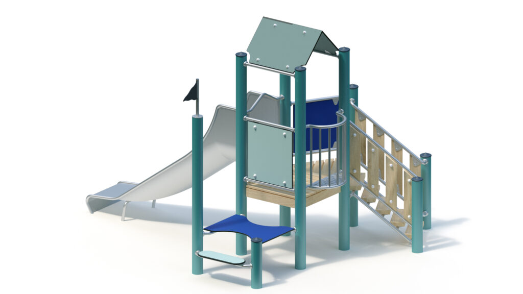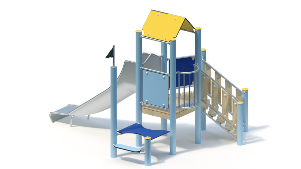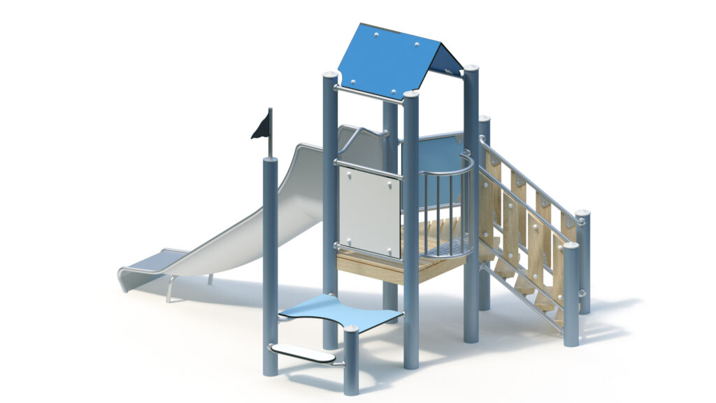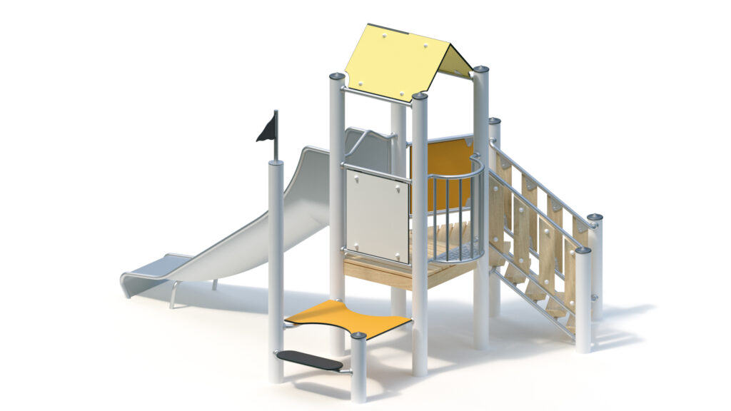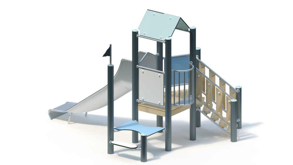Standpfosten aus Edelstahlrohr Ø 120 mm mit nicht lösbaren Pfostenkappen aus Edelstahl abgedeckt. Anschluss der modularen Anbauteile an die Standpfosten durch solide und voll verschweißte Edelstahl-Einschweißhülsen ohne hervorstehende Verbindungselemente.
