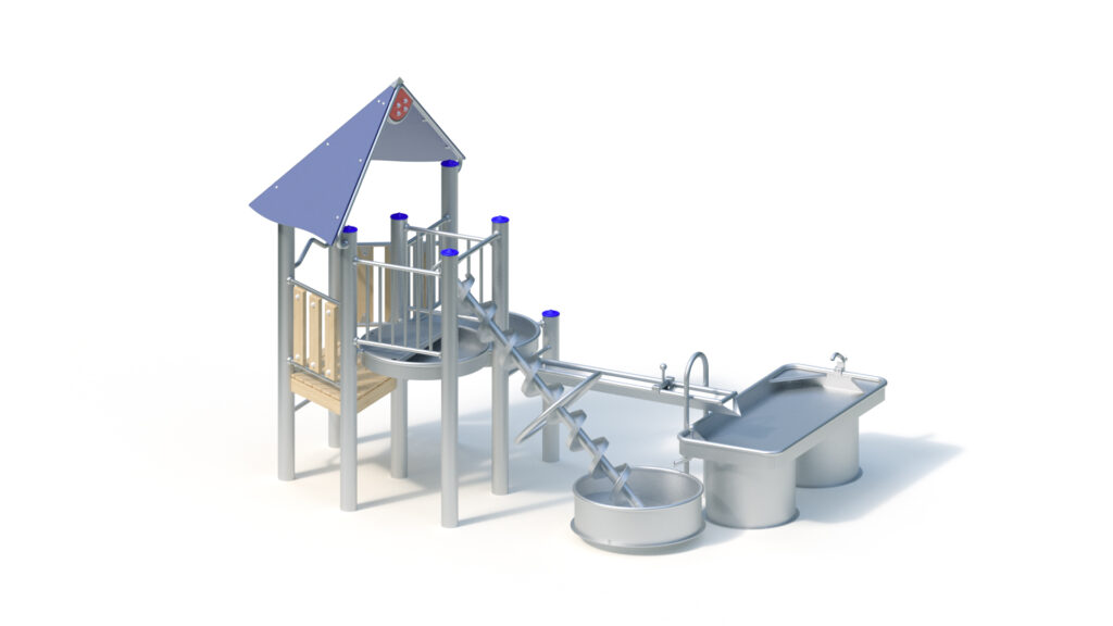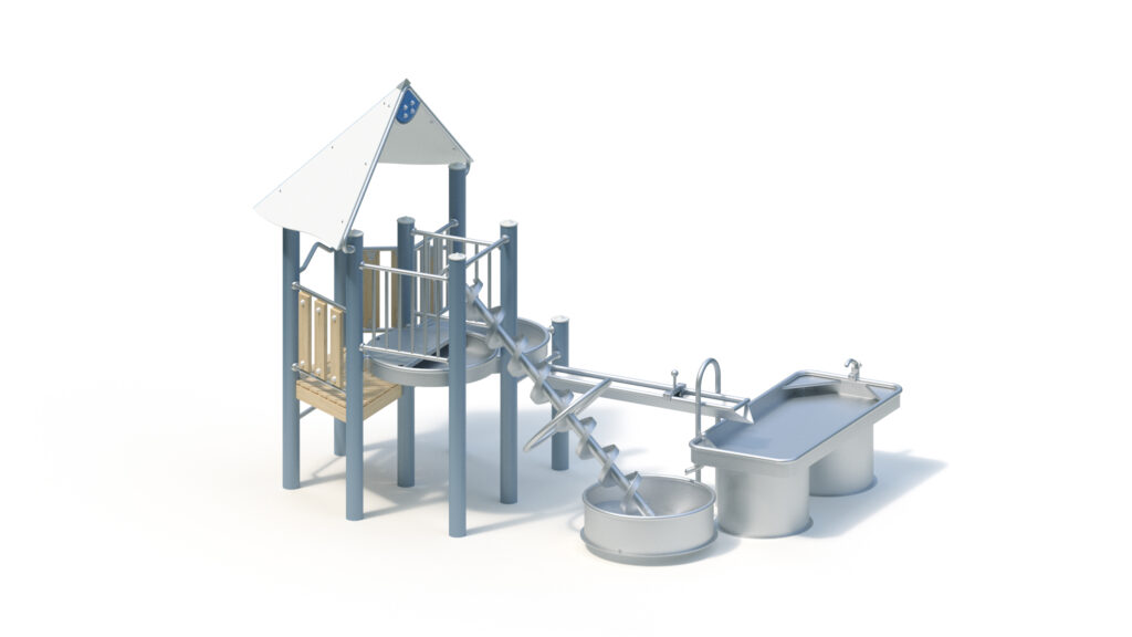 Verschweißte Edelstahlkonstruktion mit Aufnahmevorrichtung für das Fußlager der Wasserspirale, mit Ablaufbohrung. Blechdicke 2 mm / Rohr Ø 33,7 mm.