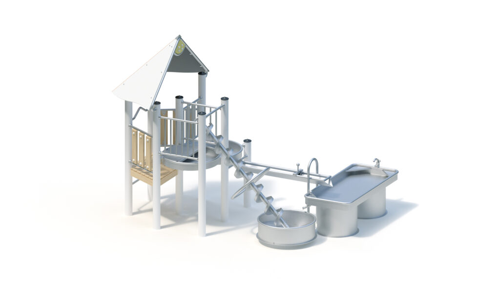 Standpfosten aus Edelstahlrohr Ø 120 x 3 mm, mit nicht lösbaren Pfostenkappen aus Edelstahl abgedeckt. Anschluss der modularen Anbauteile an die Standpfosten durch solide und voll verschweißte Edelstahl-Einschweißhülsen ohne hervorstehende Verbindungselemente.