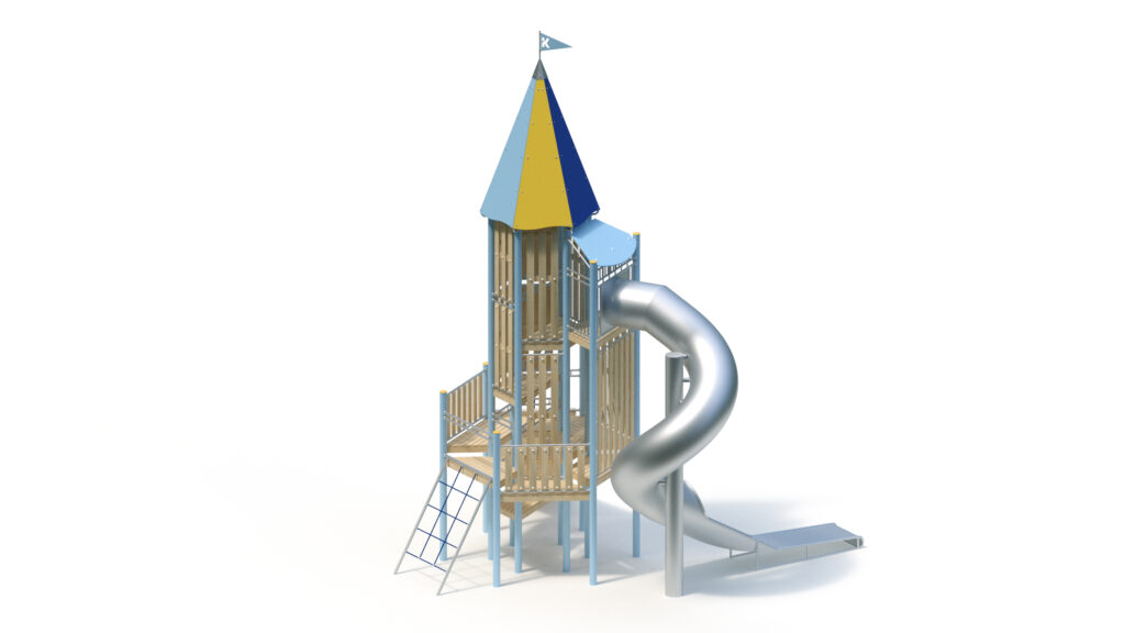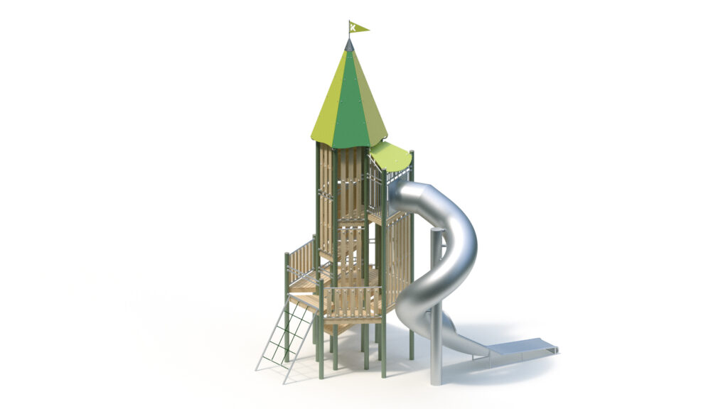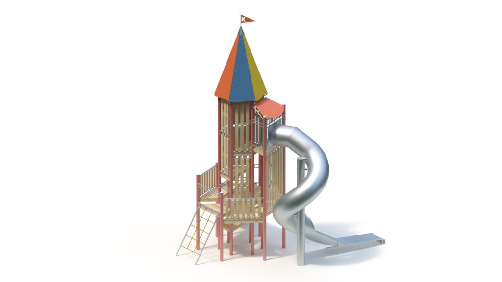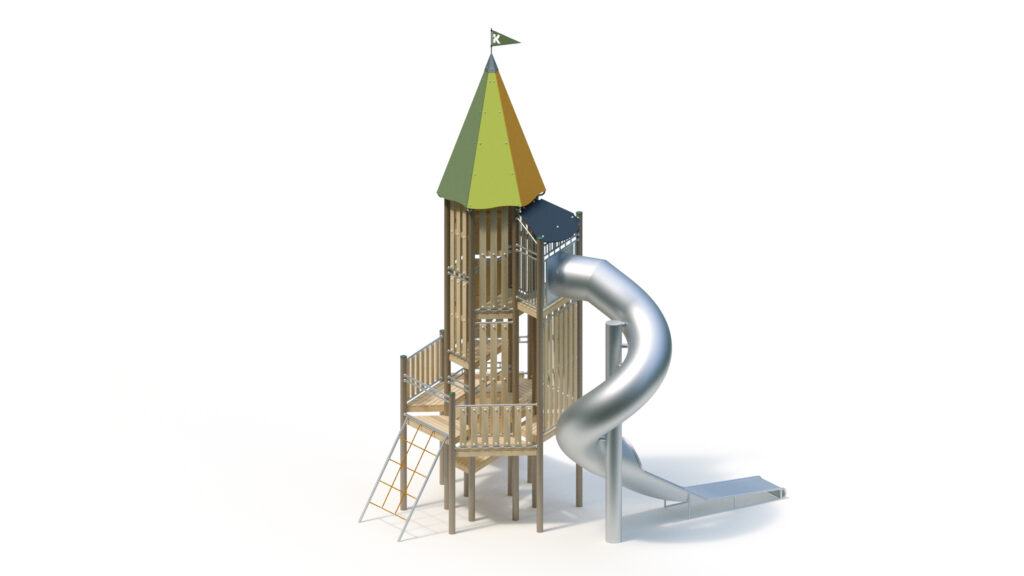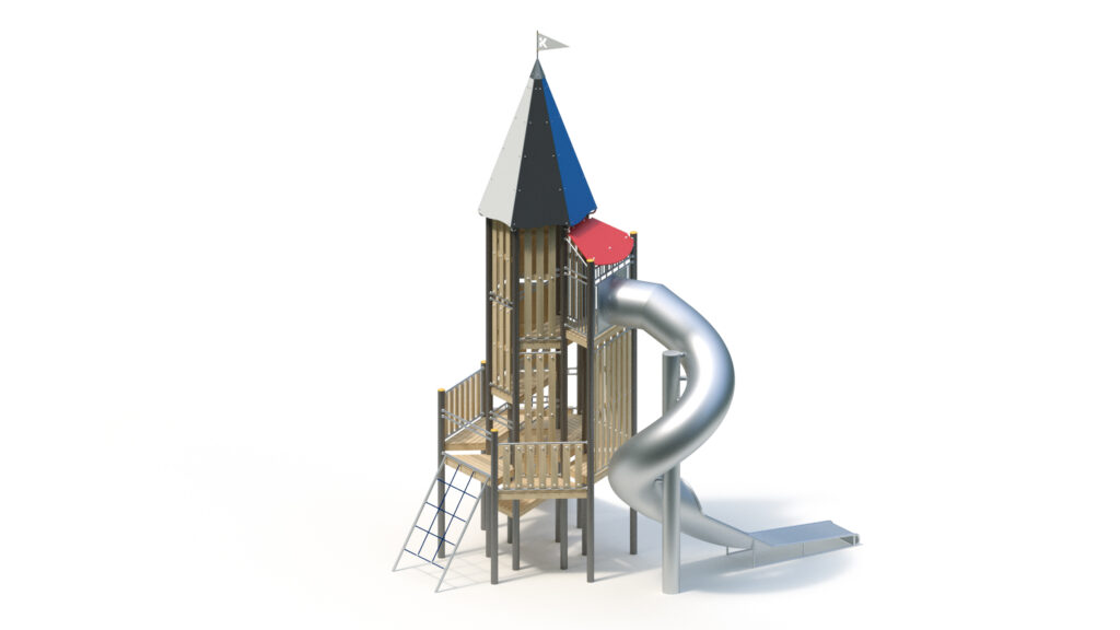 – Turmdach, Neigung 72°, aus höchst witterungsbeständiger HPL-Schichtstoffplatte (Saphir), 13 mm, runde Traufe, mit drehbarer Fahne mit Logo (Blutorange/RAL 2002)