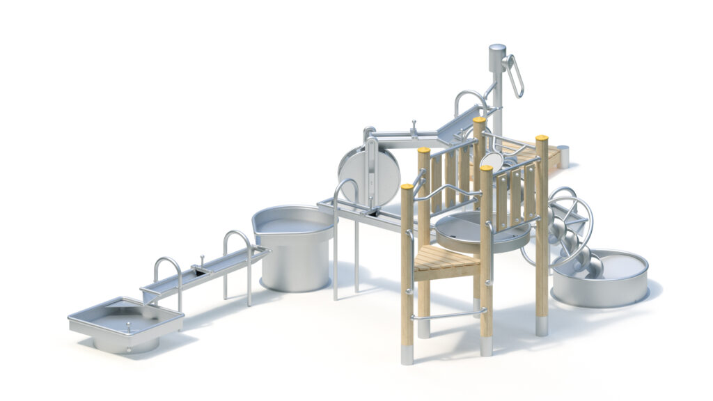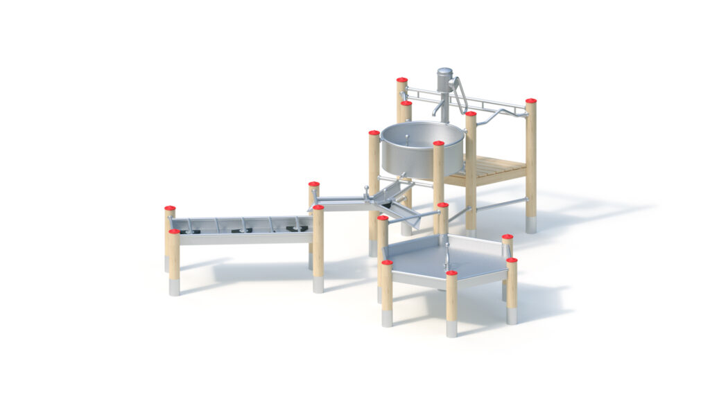 Welded stainless steel construction, for water collection from a trough on top, 12 paddle wheels, rounded on the front end, framed by side panels. Sheet metal thickness: 2 mm at least. Water wheel mounted in roller bearing. Additional support Ø 38 mm) for trough attachment