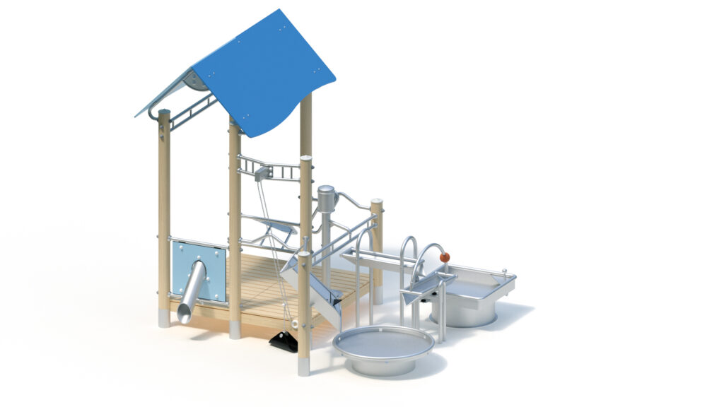 Welded structure made of stainless steel with six water outlets. Sheet metal thickness: min. 2 mm/ tube Ø 38 mm. Anchorage by means of ring-shaped bottom flange. At extra charge, there are appropriate ring-shaped concrete foundations (015165) for flange fastening and concrete form blocks (015170) for masonry works to compensate different levels or for a safe installation with loose fall protection surfacing (sand, gravel etc.)