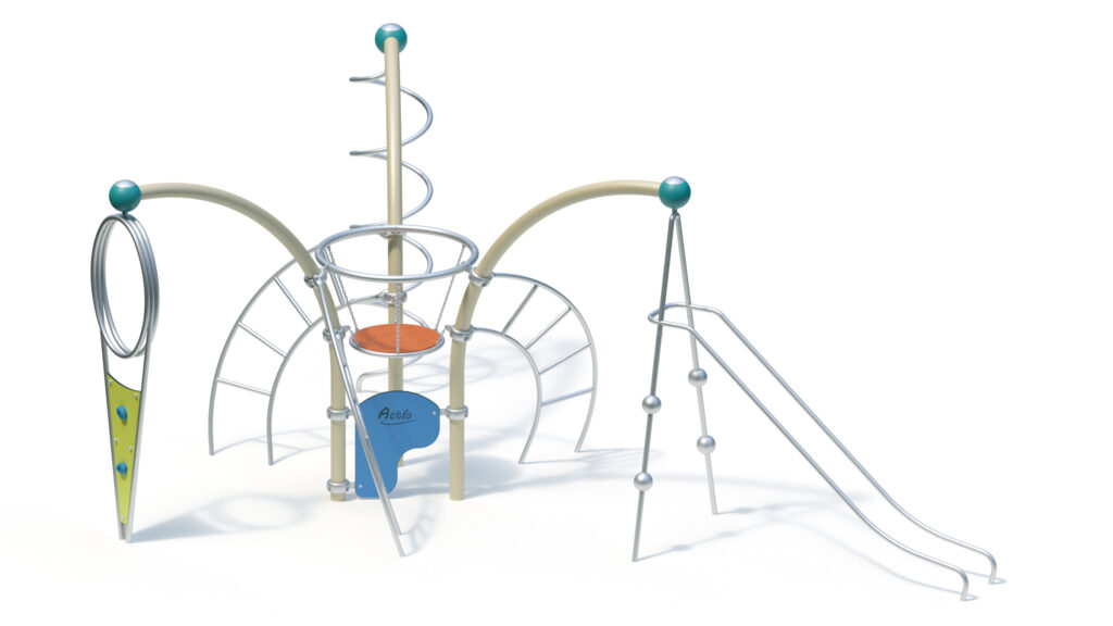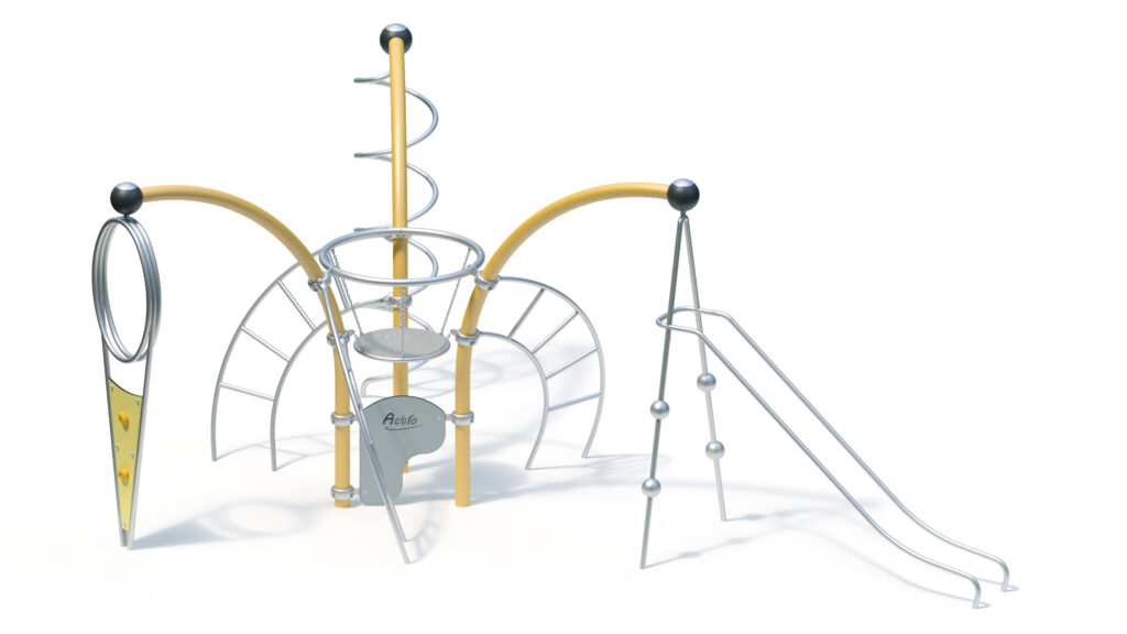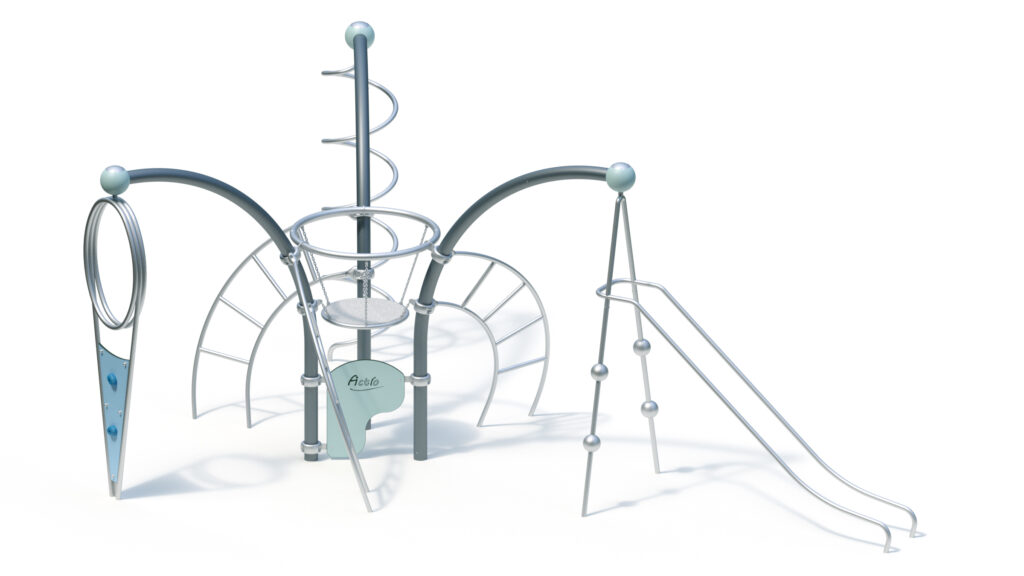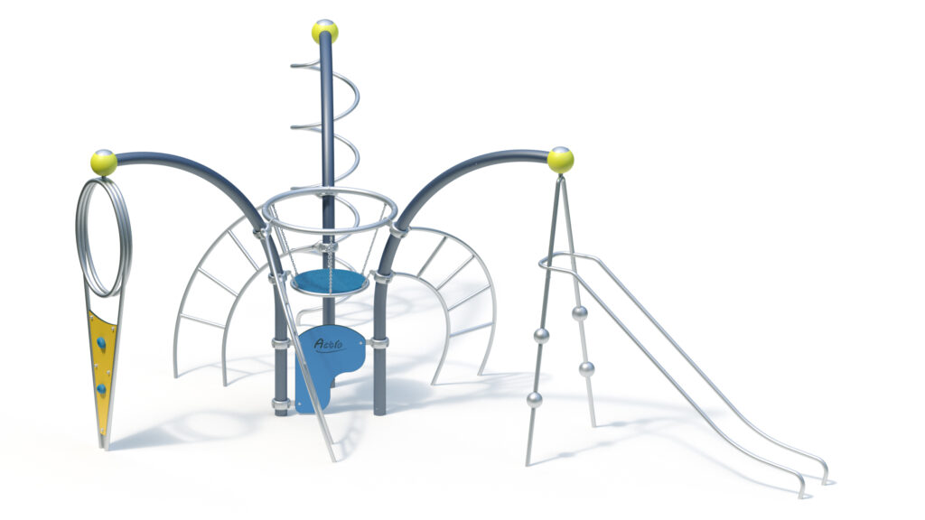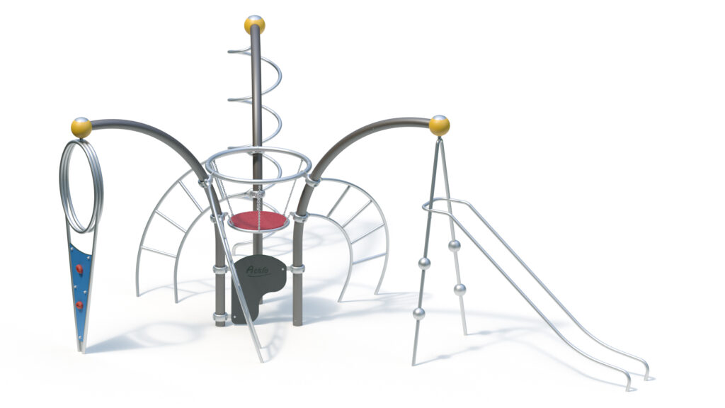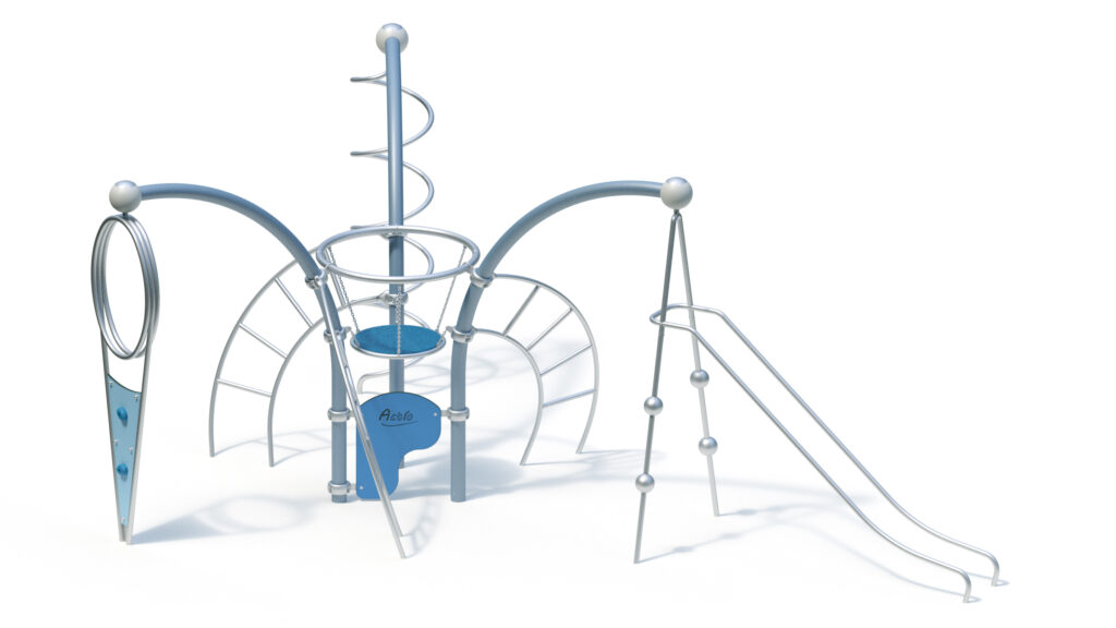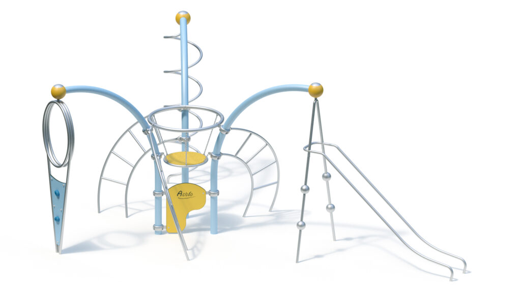 – Kletterwand aus höchst witterungsbeständiger HPL-Schichtstoffplatte Farbe blau ähnlich RAL 5015, 20 mm, in einem Rahmen aus Edelstahlrohr Ø38 ; mit einseitig aufgesetzten Freeclimbing-Elementen