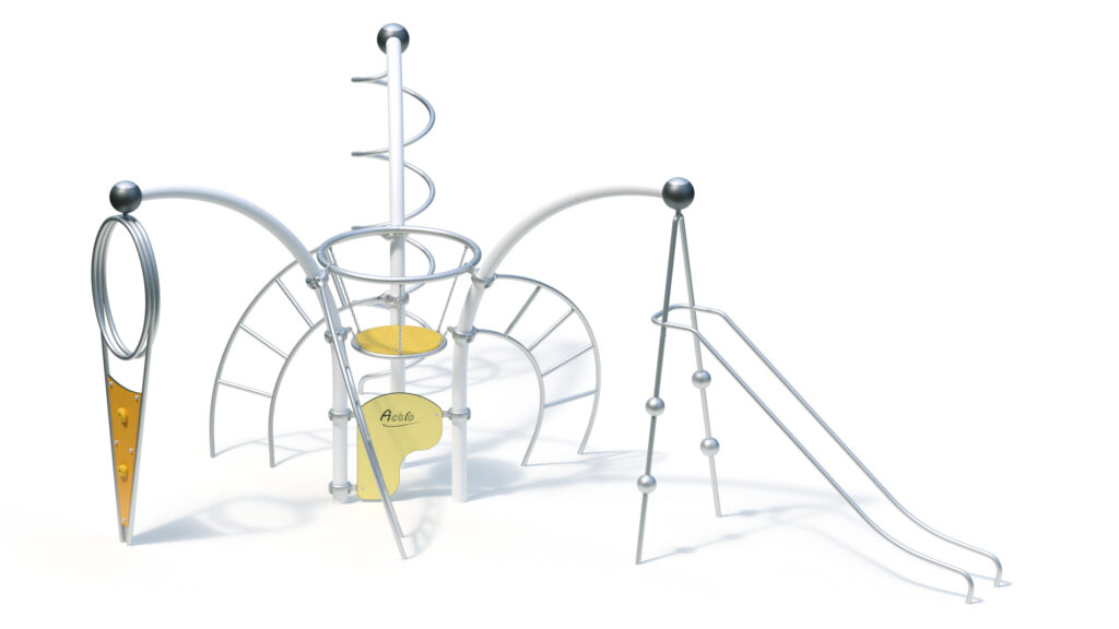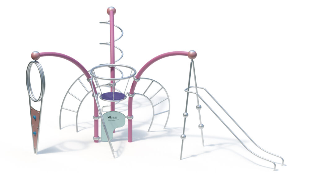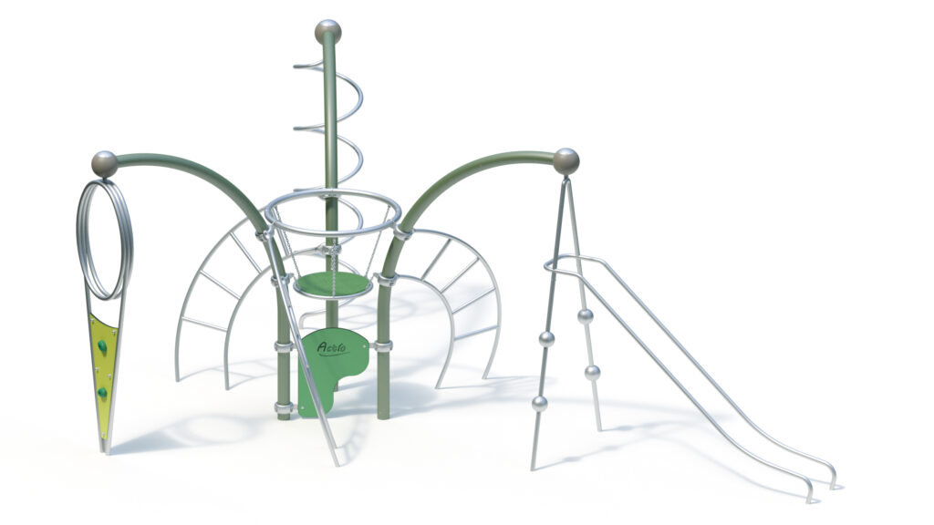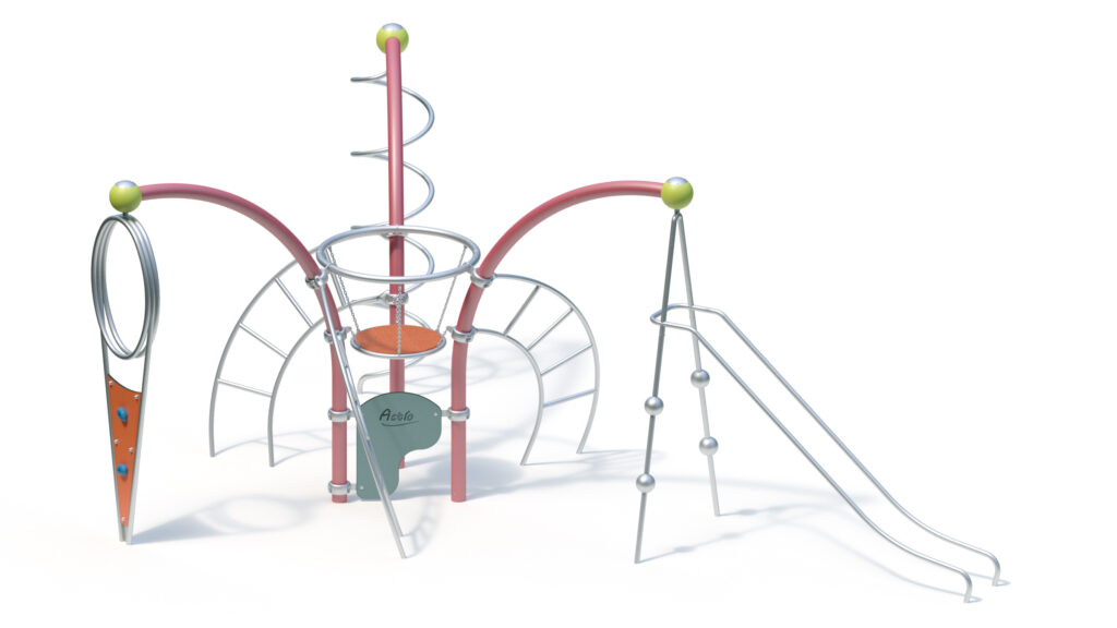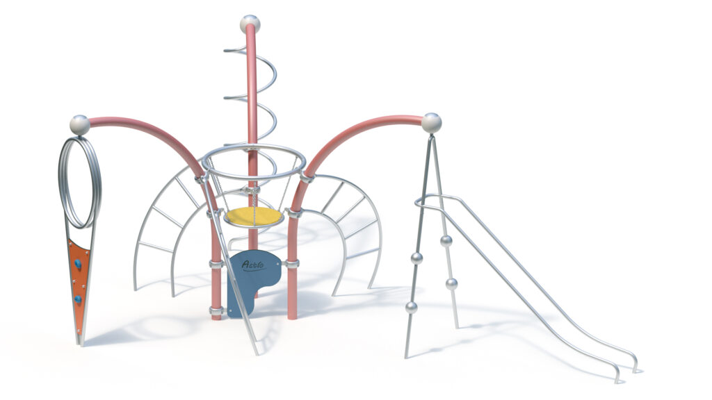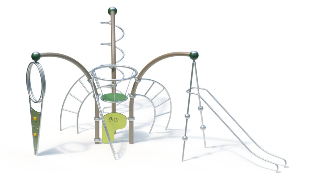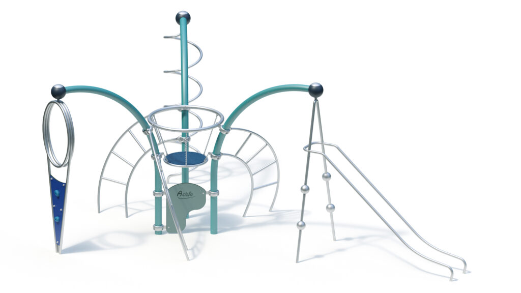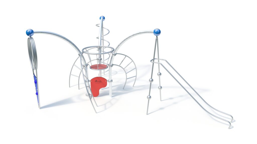 – Kletterwand aus höchst witterungsbeständiger HPL-Schichtstoffplatte Farbe blau ähnlich RAL 5015, 20 mm, in einem Rahmen aus Edelstahlrohr Ø38 ; mit einseitig aufgesetzten Freeclimbing-Elementen