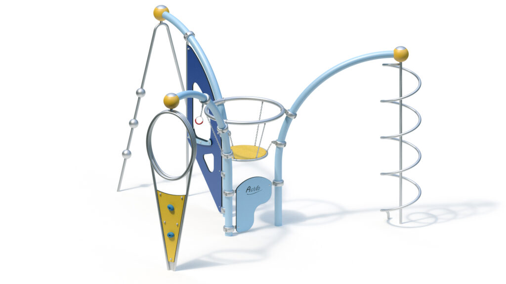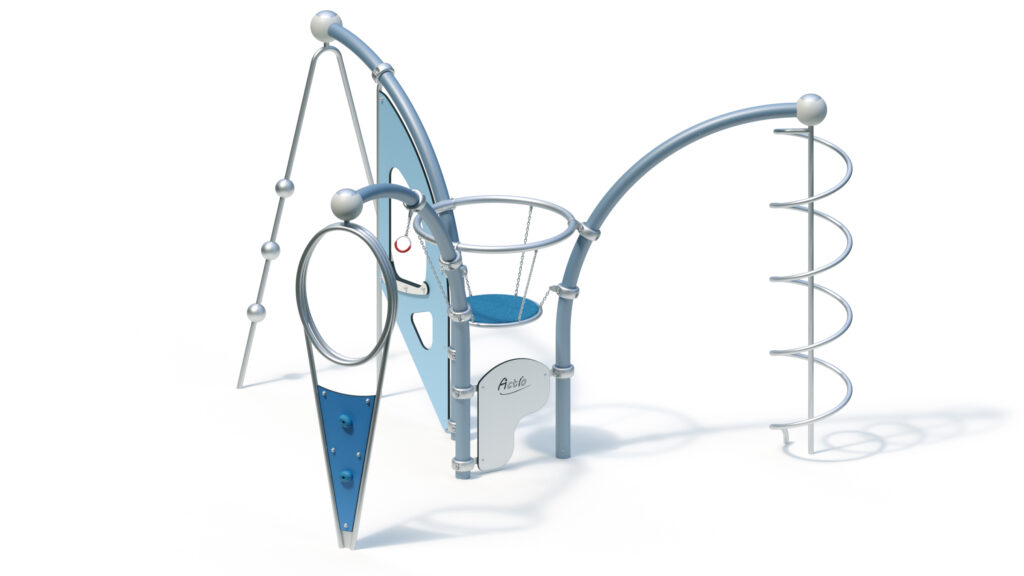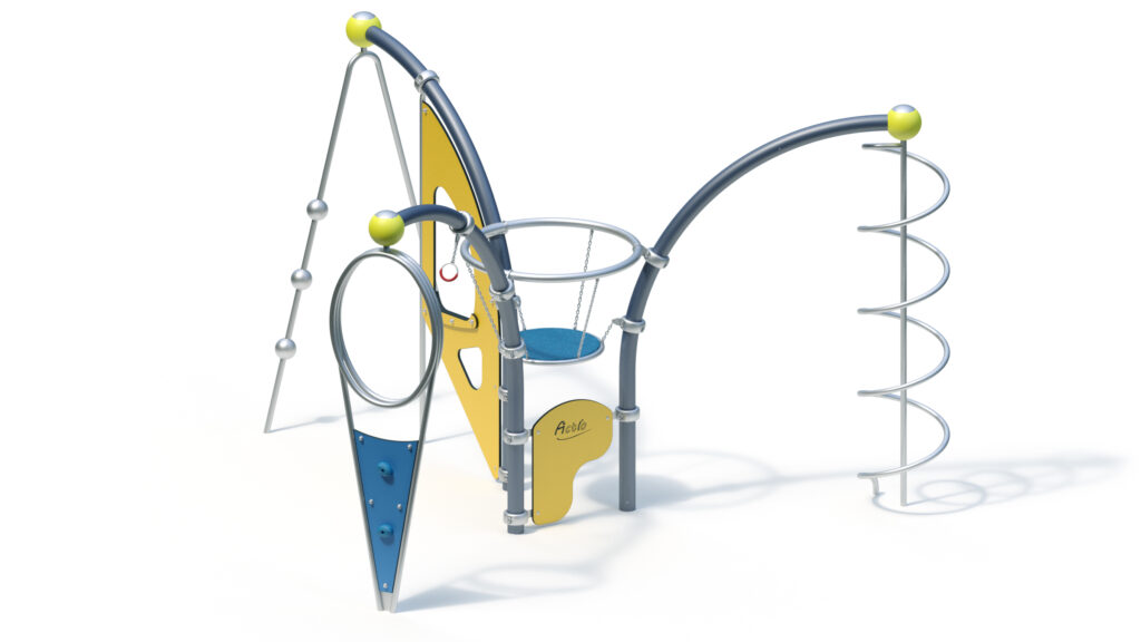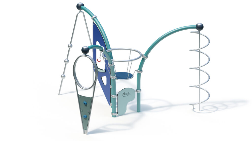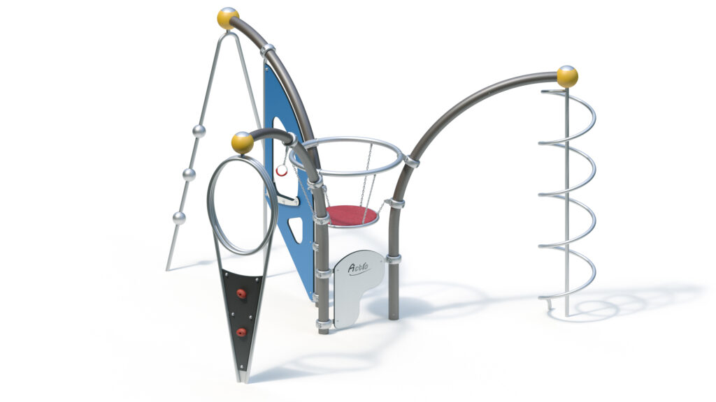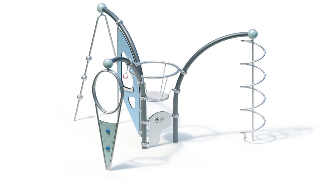 – climbing wall made from a coloured highly weather-resistant HPL panel (20 mm thickness) in blue similar to RAL 5015, with free climbing elements fitted to one side, framed in a tubular stainless steel construction Ø38