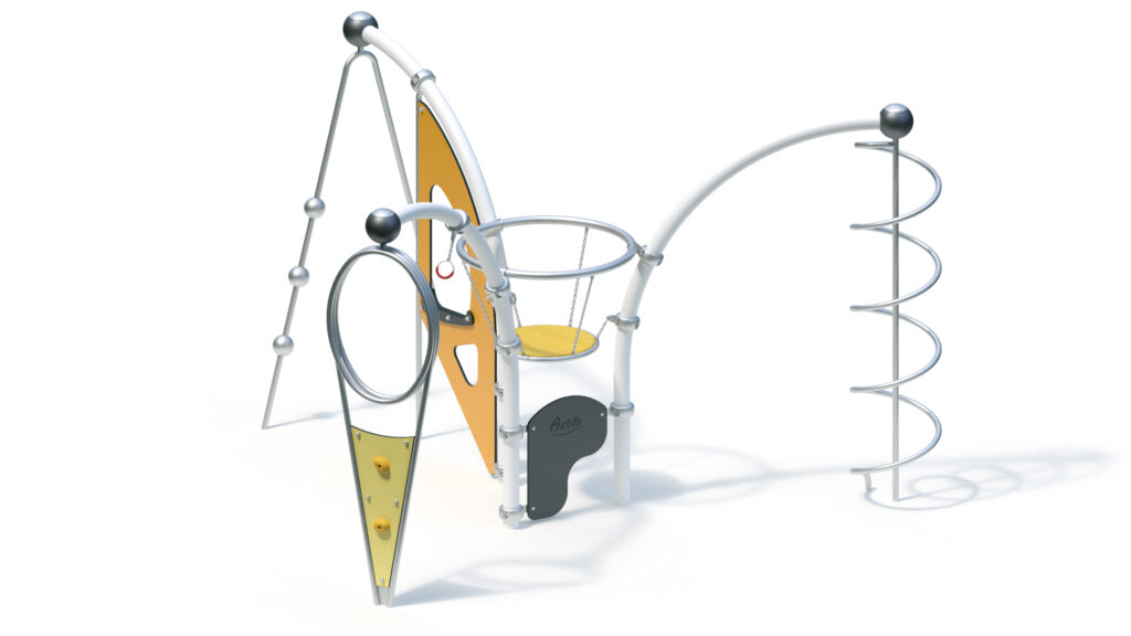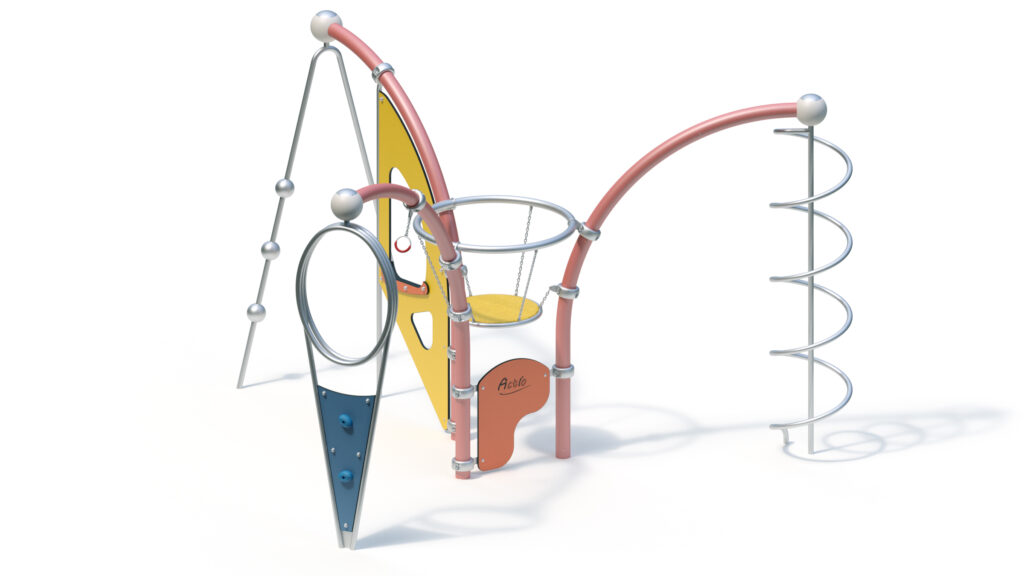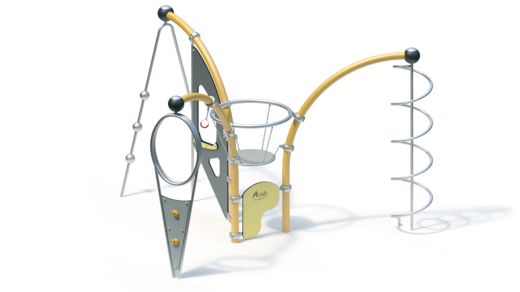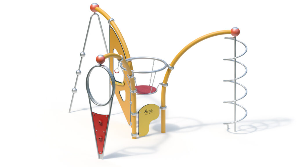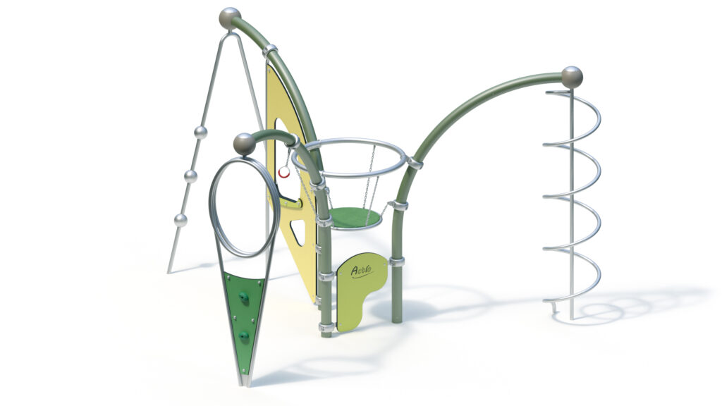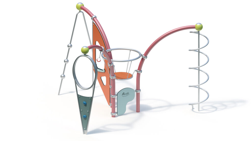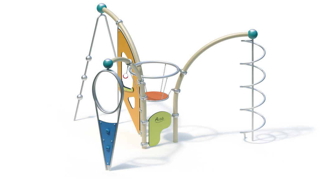 – climbing wall made from a coloured highly weather-resistant HPL panel (20 mm thickness) in blue similar to RAL 5015, with free climbing elements fitted to one side, framed in a tubular stainless steel construction Ø38