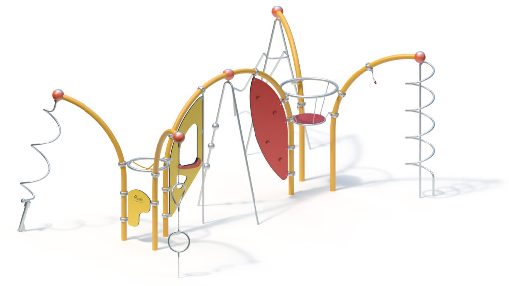 – climbing wall made from a coloured highly weather-resistant HPL panel (20 mm thickness) in red similar to RAL 2002, with free climbing elements fitted to both sides