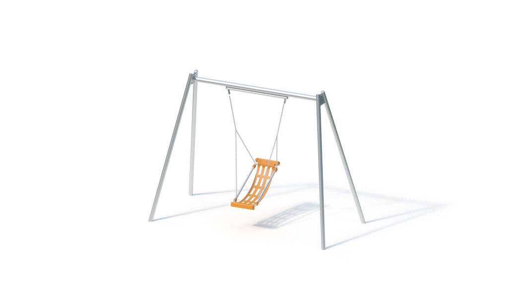 – boat swing seat, certified according to EN 1176-1/-2, retaining persons with a reduced sense of balance, gripping ability or coordination, consisting of a cradle-shaped synthetic rubber mould facilitating impact absorbing zones and a reinforcing steel wire inlay from Ø 4 mm to prevent from rupture, circumferential frame made from a corrosion-resistant stainless steel tube of Ø 35 mm thickness, wall thickness 1,5 mm, with 4 attachment elements for chains of Ø 7 mm