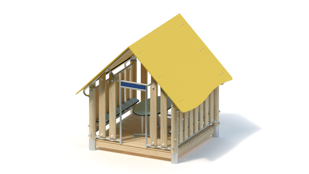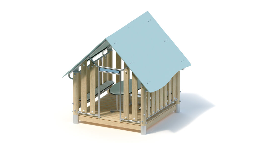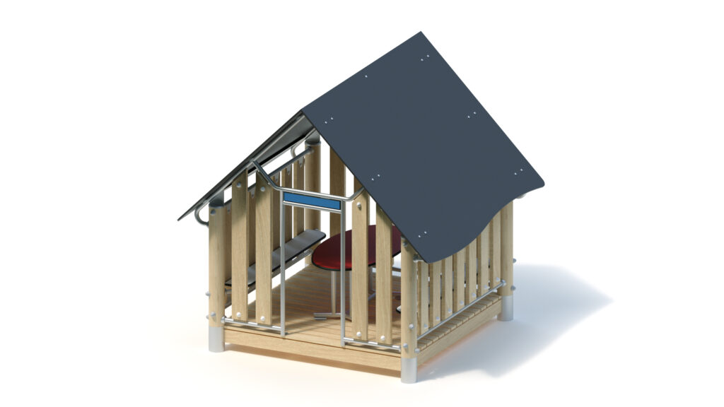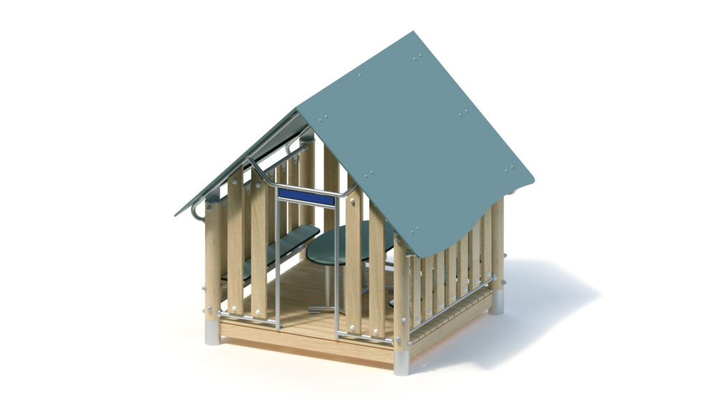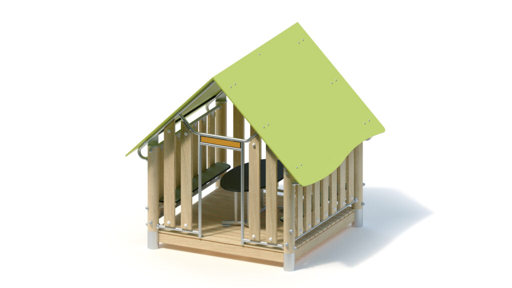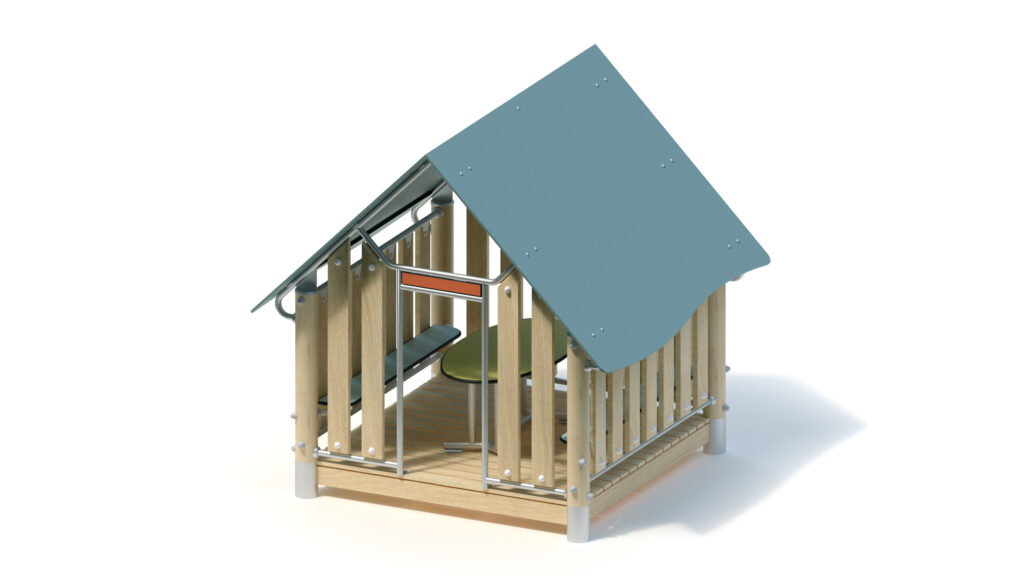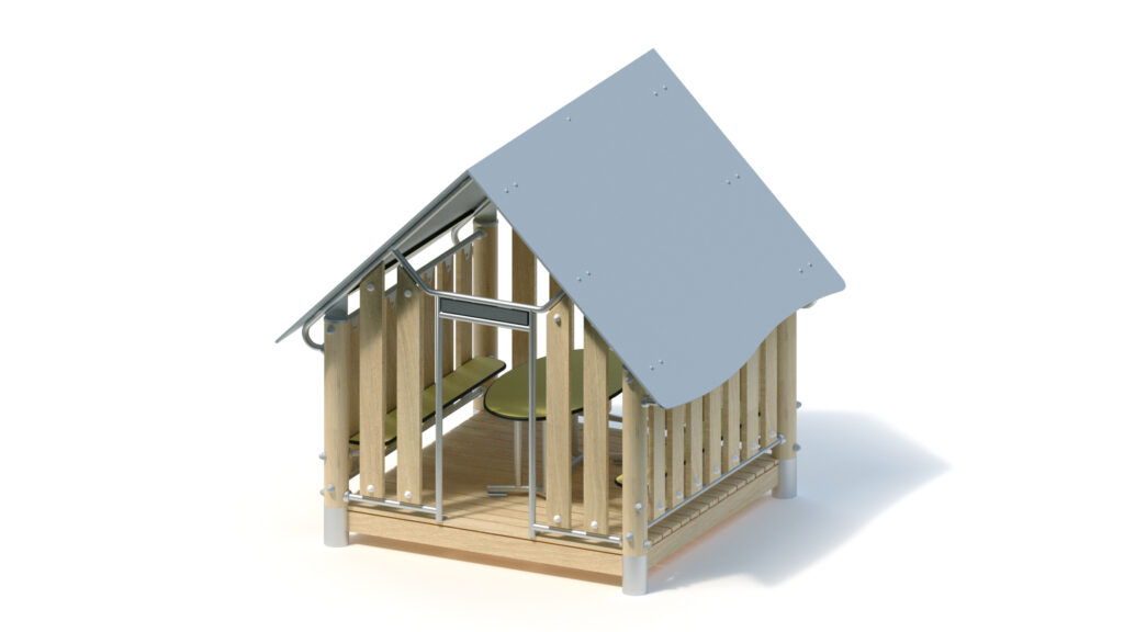 – Giebelwand (1,60) mit Eingang und Schild: Holzbrüstung aus Robinie 125 x 30 mm, Befestigung zwischen Edelstahlrohren Ø 33,7 x 2 mm; mittige Eingangsöffnung mit Schild aus HPL-Platte
