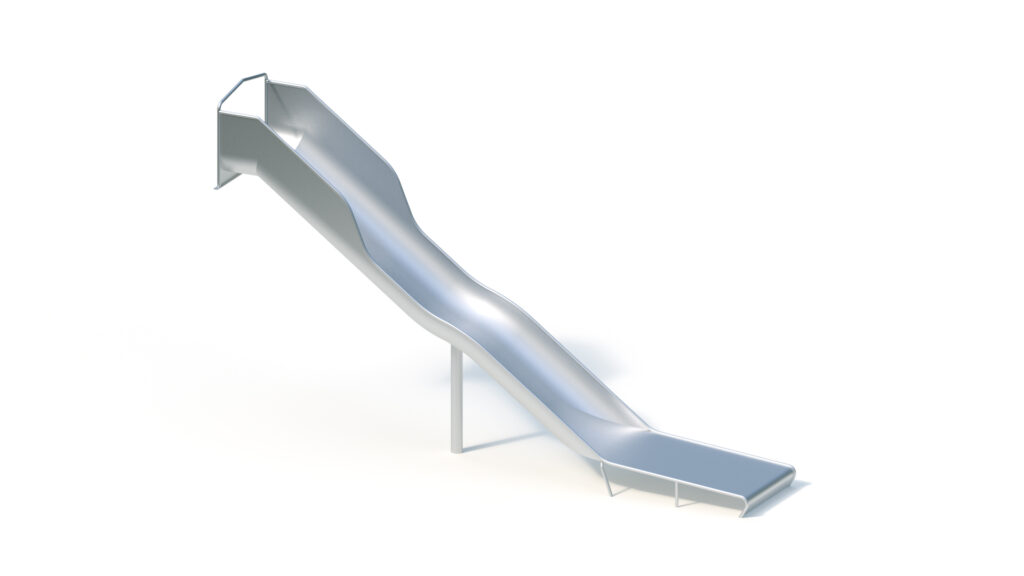 Einteilige Edelstahlkonstruktion, mit zusätzlicher Stütze im Auslaufbereich. Geschwindigkeitsregulierung durch Welle. Durch Muldenform besonders geräuscharm.