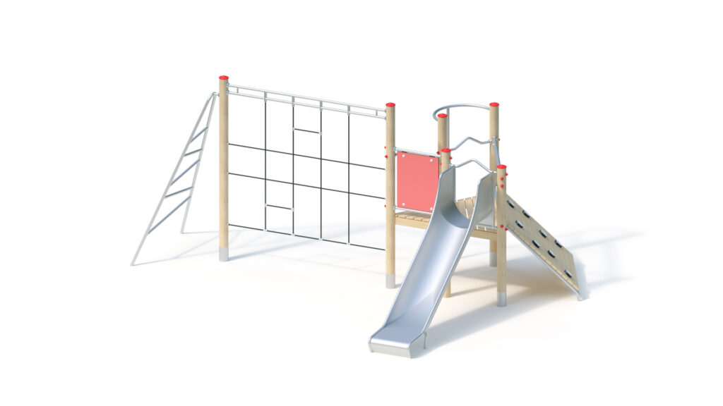 – Kraxelwand aus Robinienholz mit aufgesetzten Kletterelementen aus HPL-Schichtstoffplatte, 20 mm