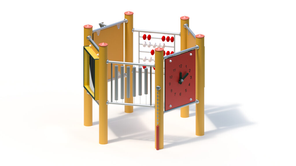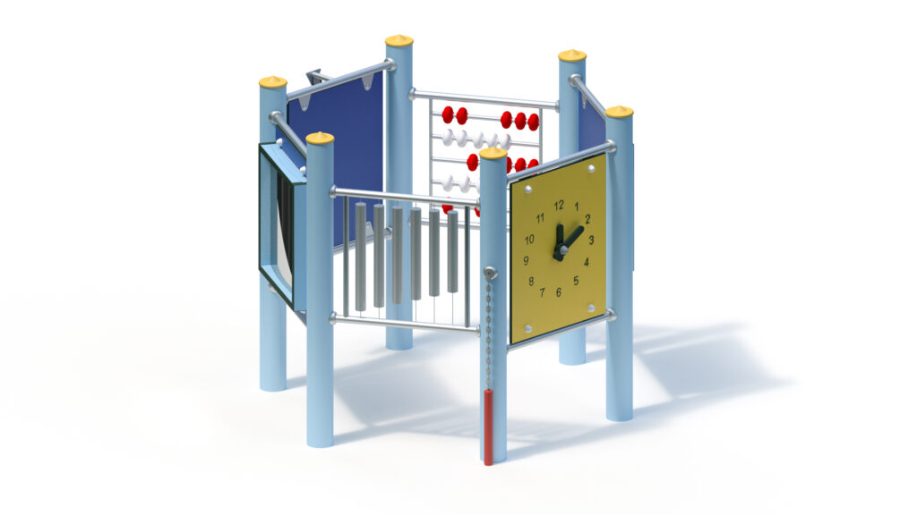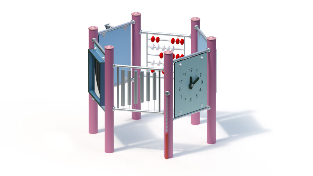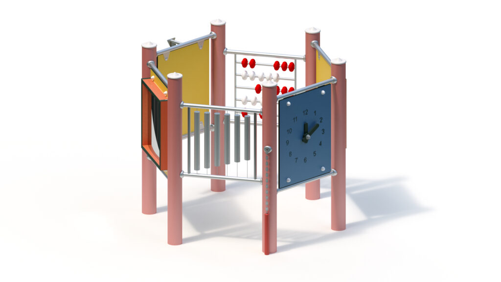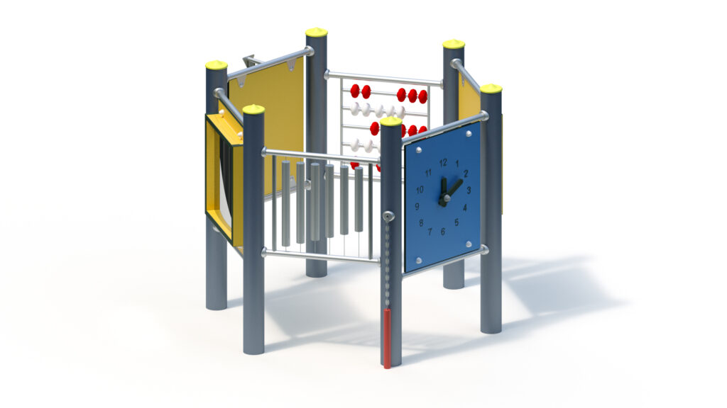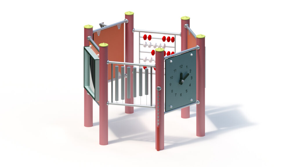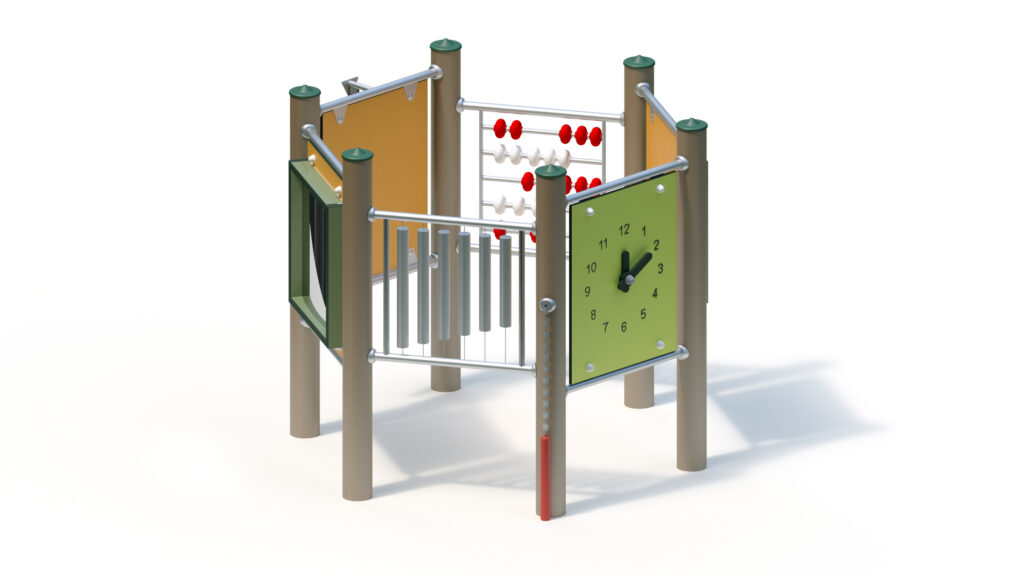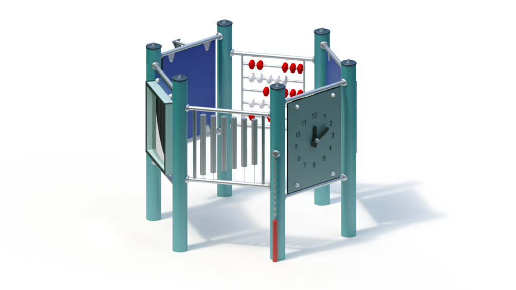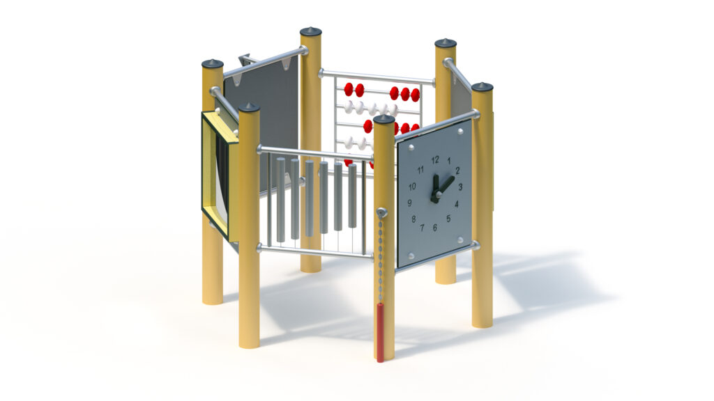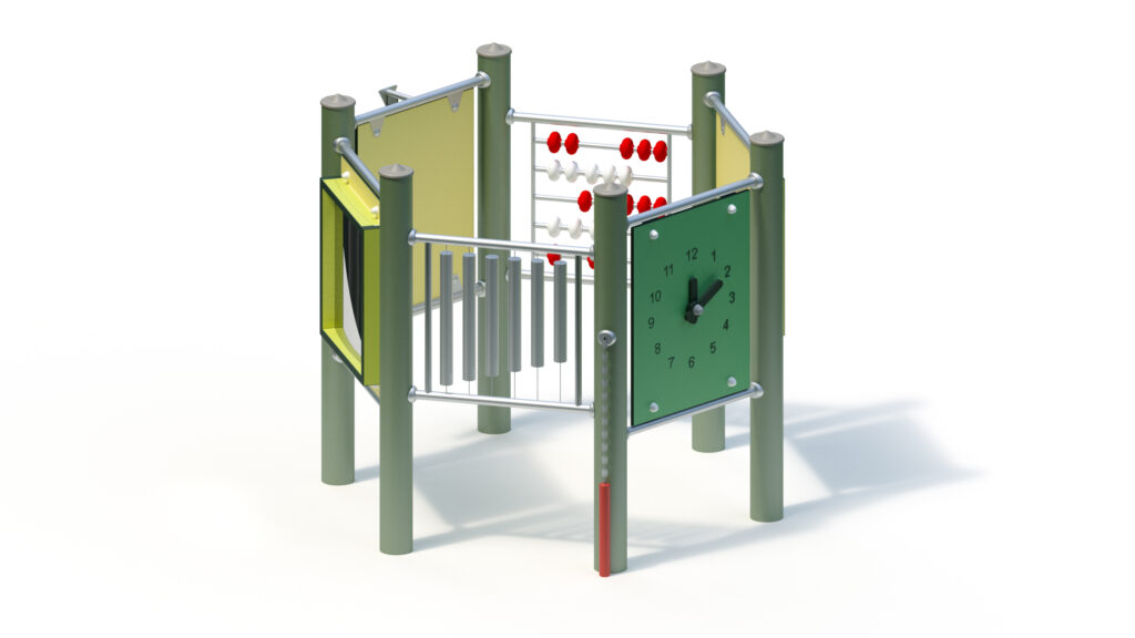 – infill panel made from highly weather-resistant coloured HPL, framed by stainless steel tubes Ø 33,7×2 mm, with clock hands made from coloured HPL panels for manual time adjustment