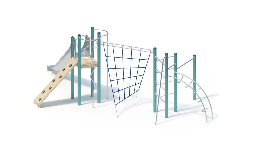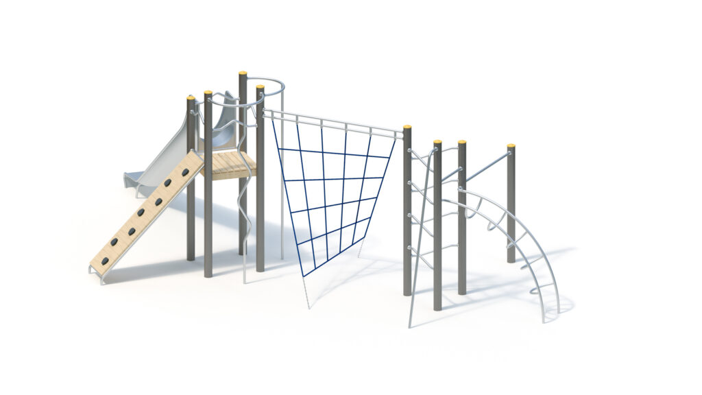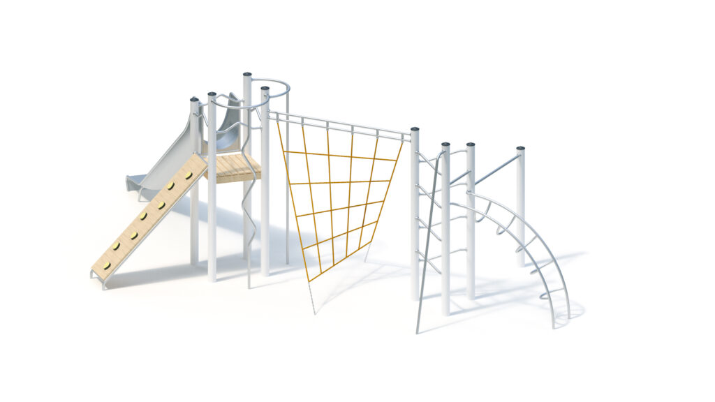 – climbing net from Hercules ropes suspended from stainless steel tandem crossbeam, twisted at an angle of 90°