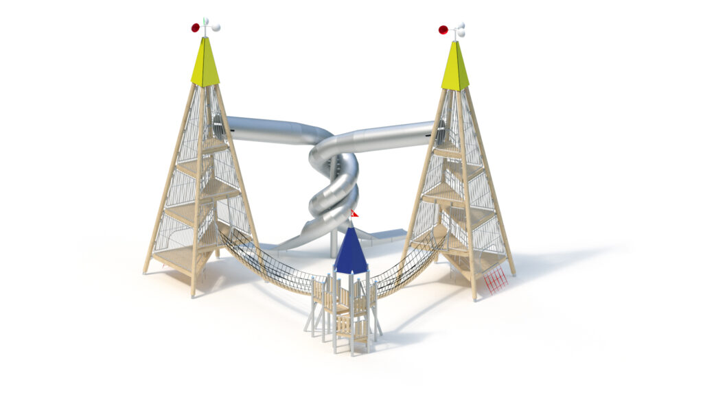 Two Dalben towers (10,50) with climbing net access made from chains (1,00 m) and three-piece wind rotor, linked by a combined roller/tunnel slide (6,00).
