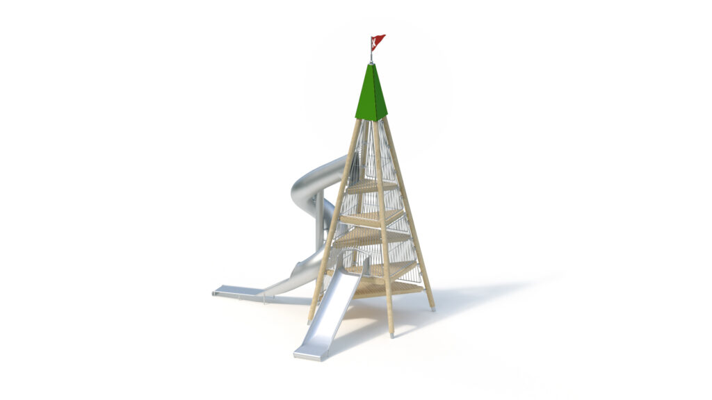 – Dalbenturm (7,50) mit Tunnel-Hangrutsche (3,00 m) und Netzaufstieg (2,00 m), Turmhaube blau
