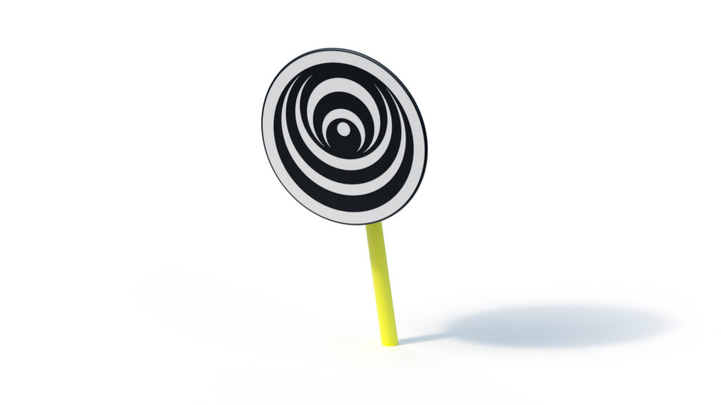 Effektscheibe: Hochdrucklaminat 25 mm, eingefrästes Sichelmotiv bildet bei langsamer Umdrehung einen dreidimensionalen Kegel und Trichter.