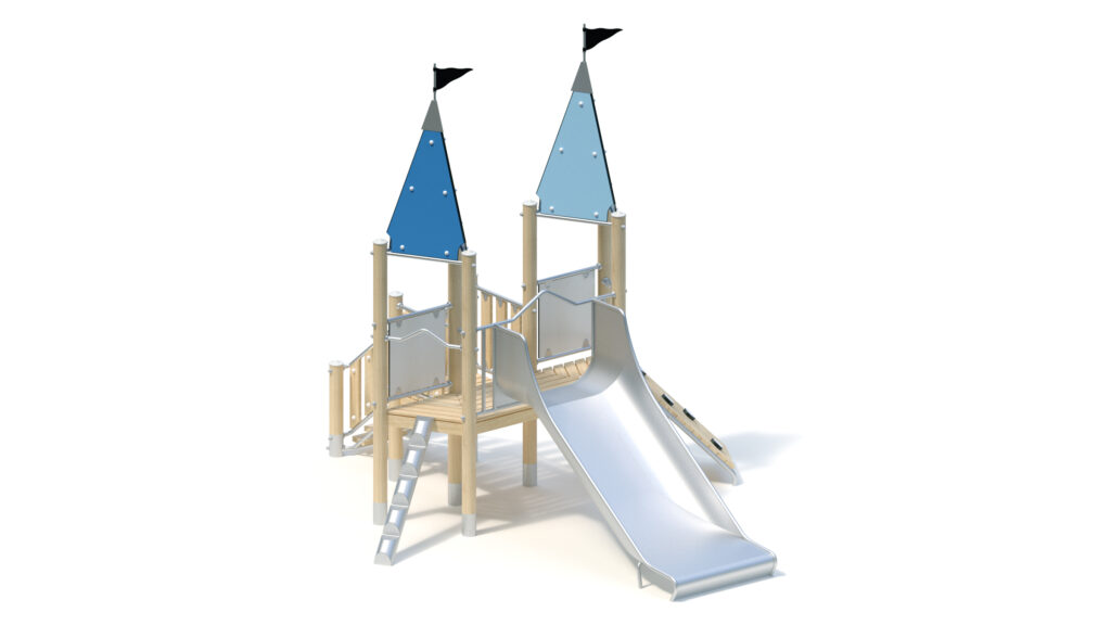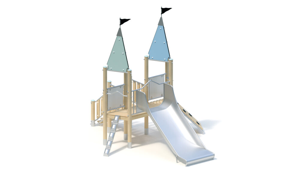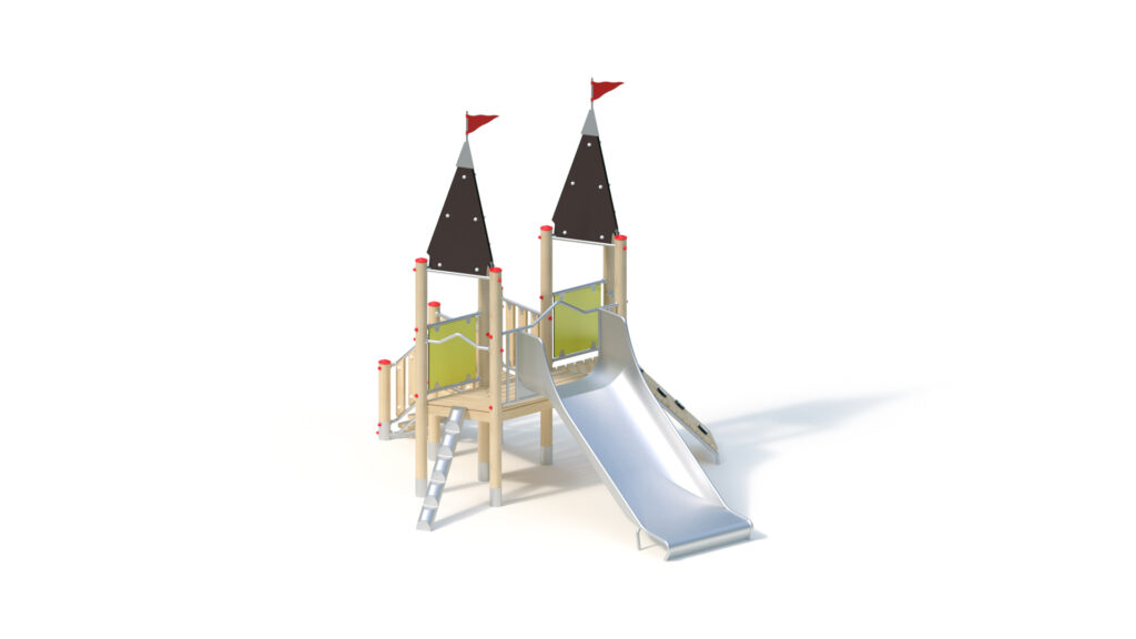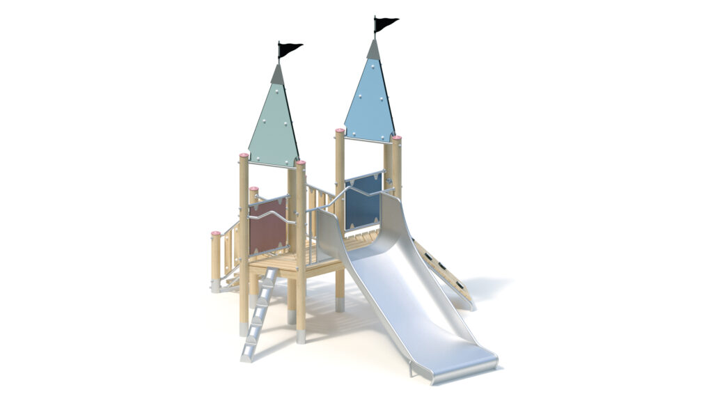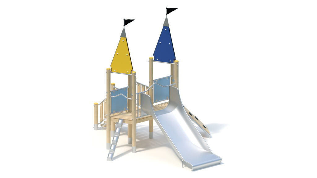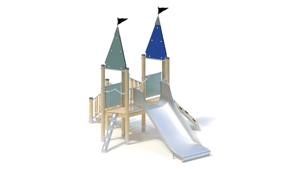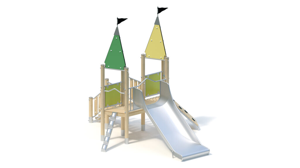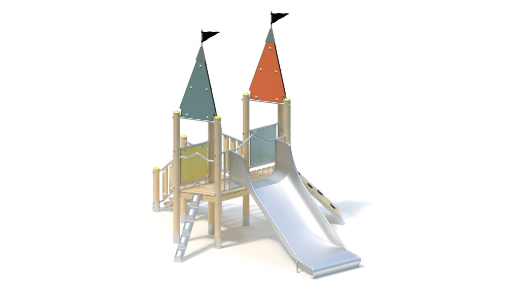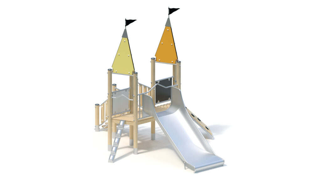 – Kraxelwand aus Robinienholz mit aufgesetzten Kletterelementen aus HPL-Schichtstoffplatte, 20 mm
