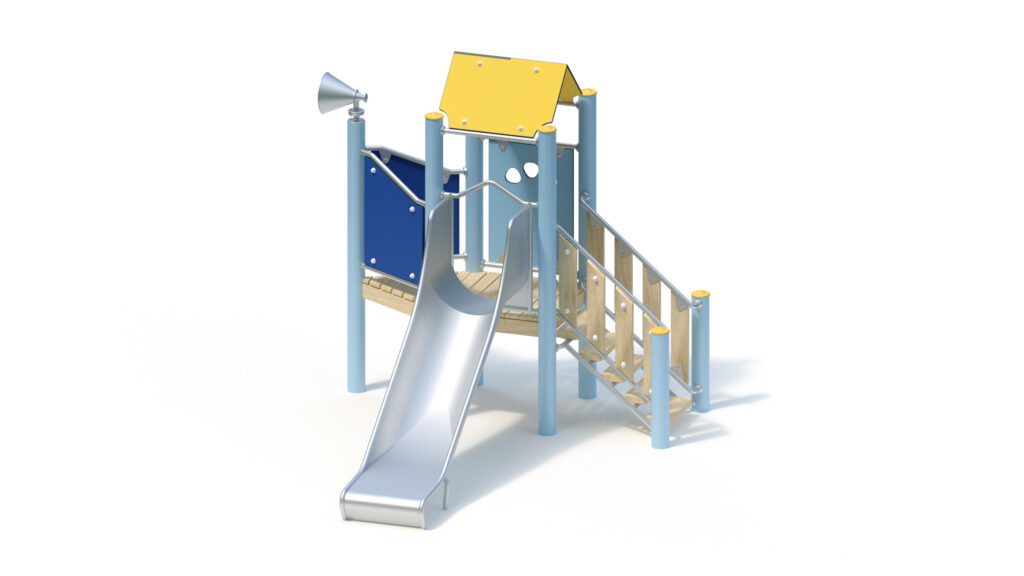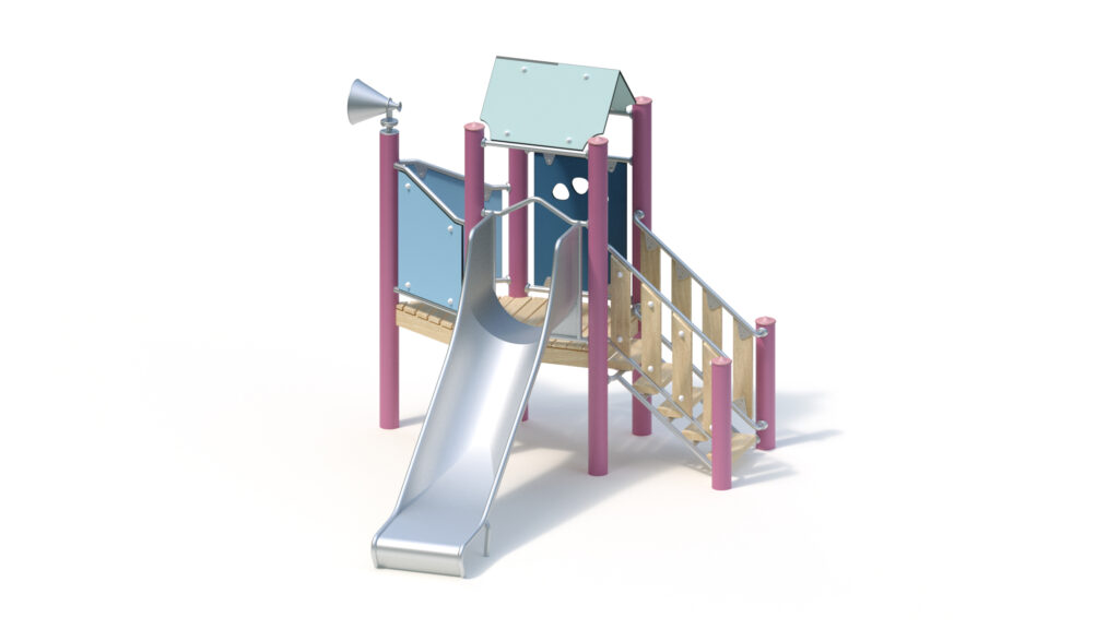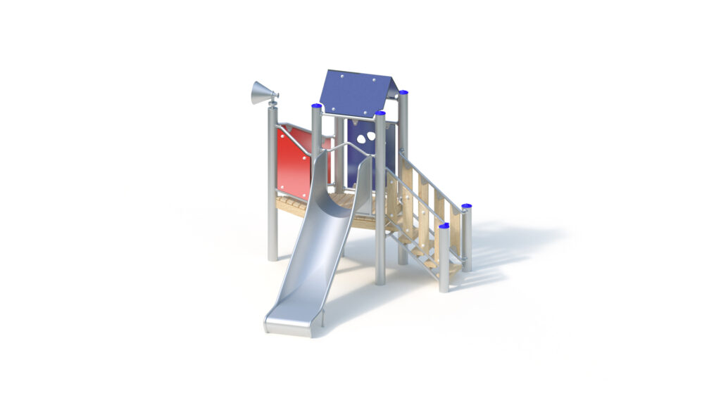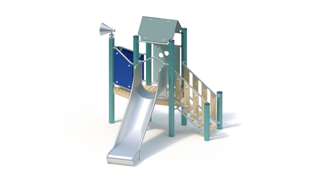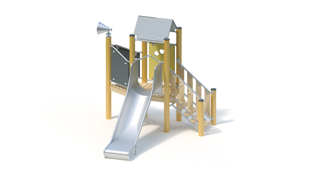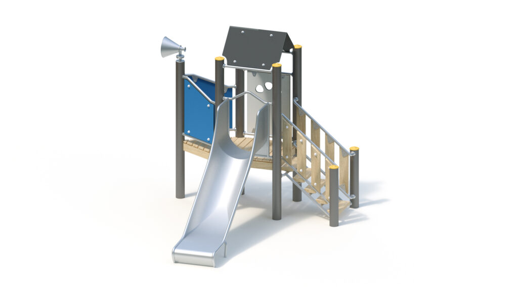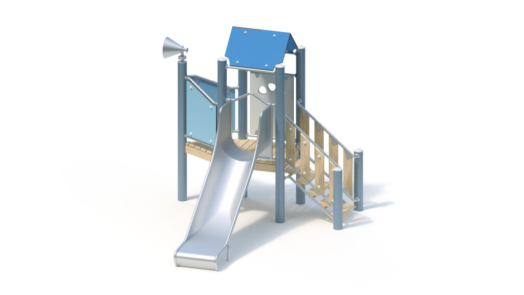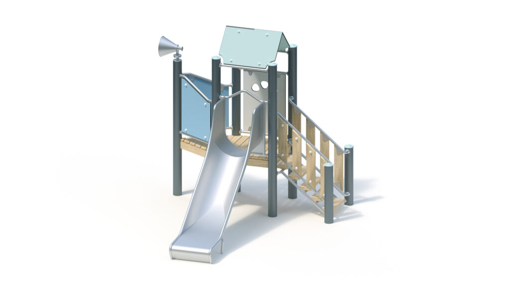 Standpfosten aus Edelstahl Ø 120 mm mit nicht lösbaren Pfostenkappen aus Edelstahl abgedeckt. Anschluss der modularen Anbauteile an die Standpfosten durch solide und voll verschweißte Edelstahl-Einschweißhülsen ohne hervorstehende Verbindungselemente.