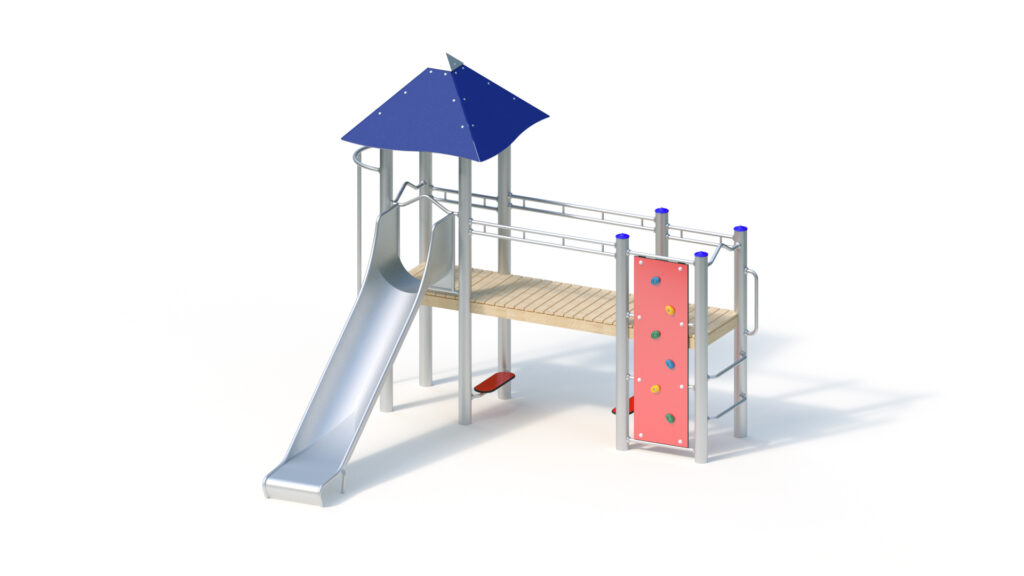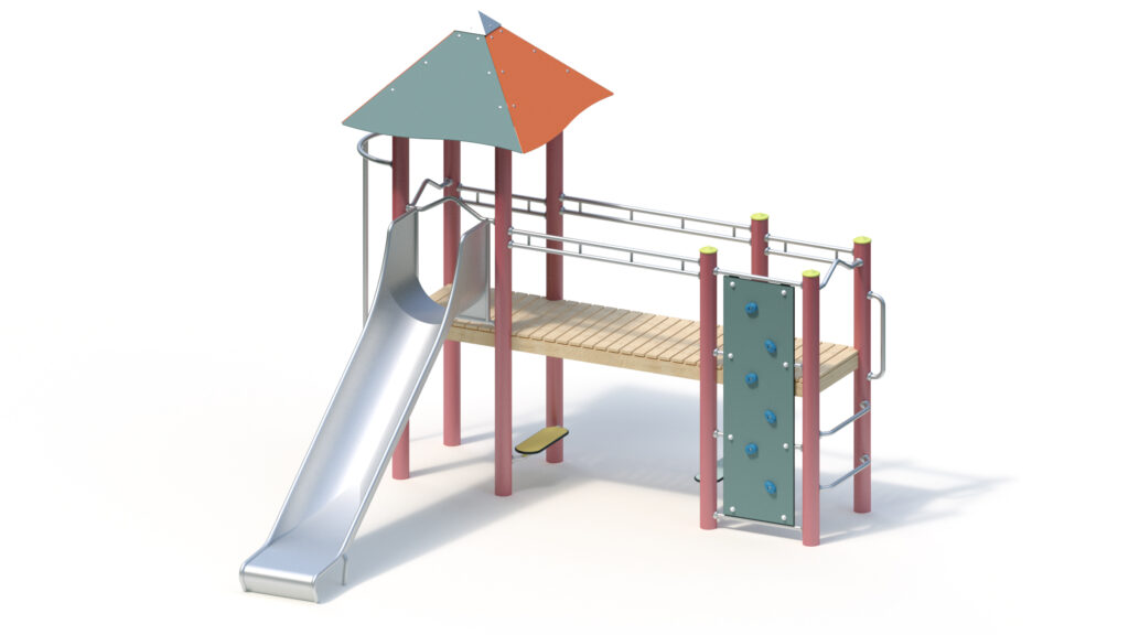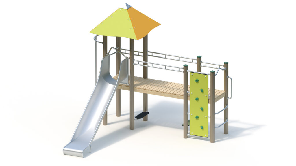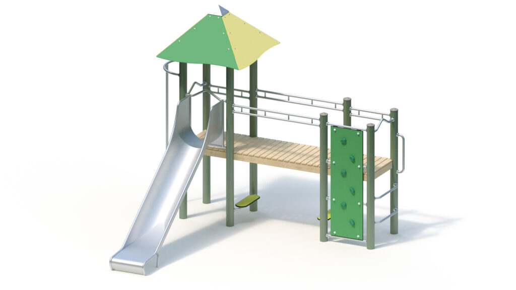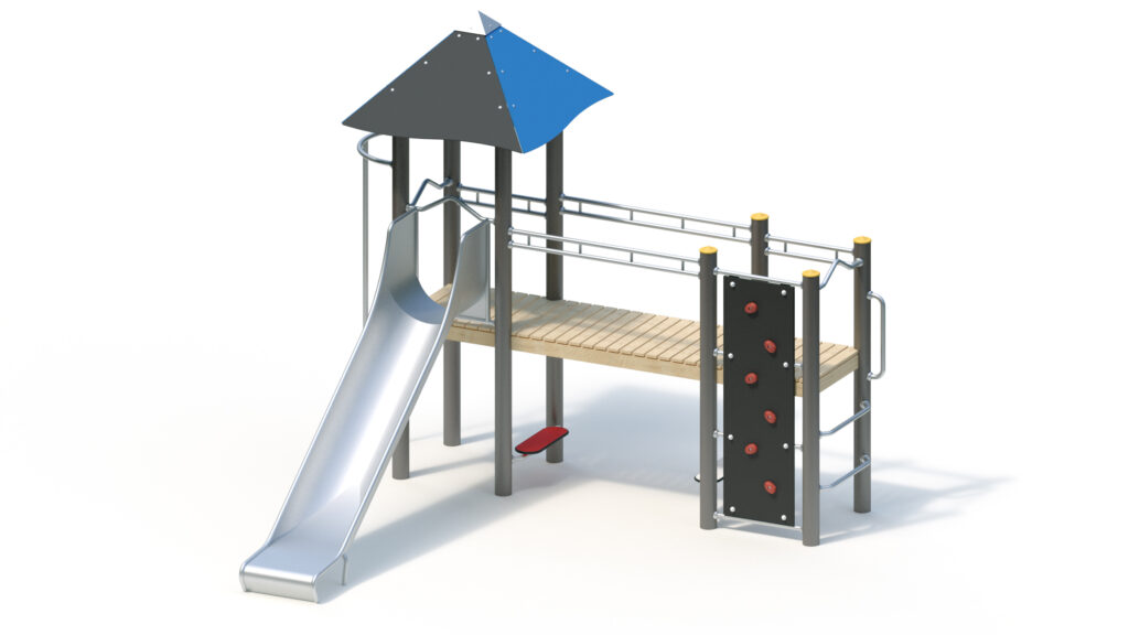 – Kletterwand aus höchst witterungsbeständiger HPL-Schichtstoffplatte, 20 mm, Befestigung zwischen Edelstahlrohren, mit einseitig aufgesetzten Freeclimbing-Elementen