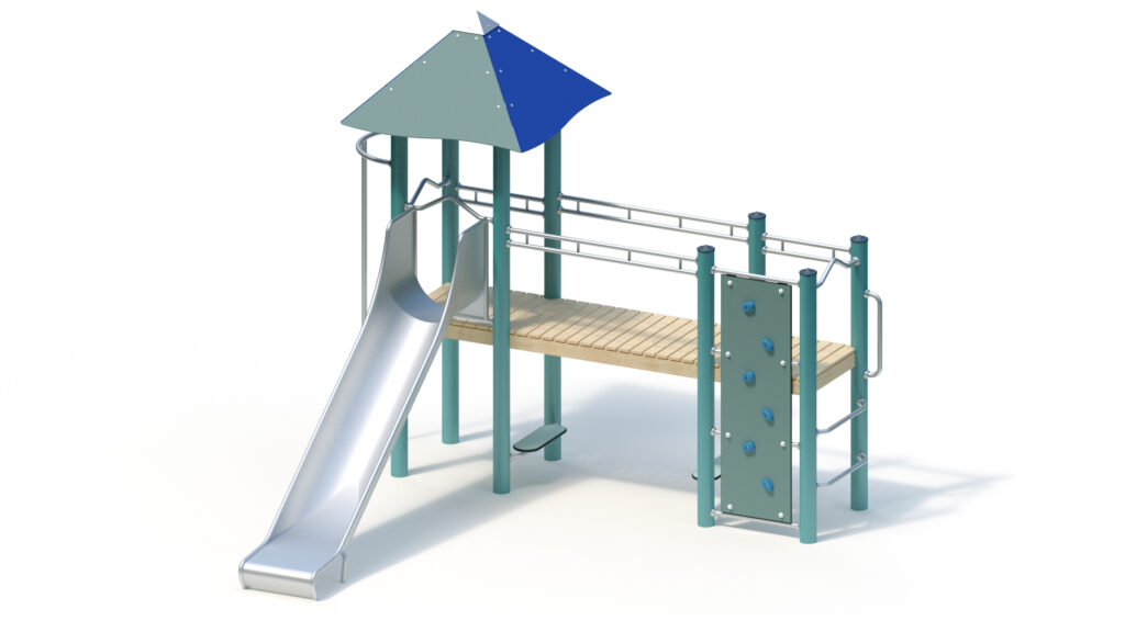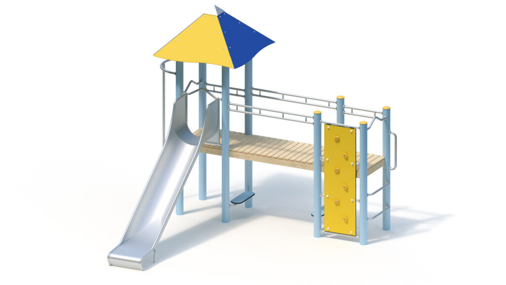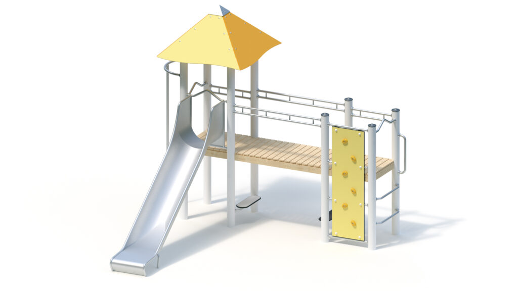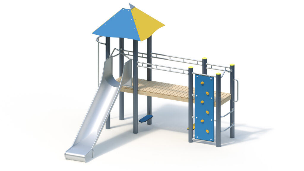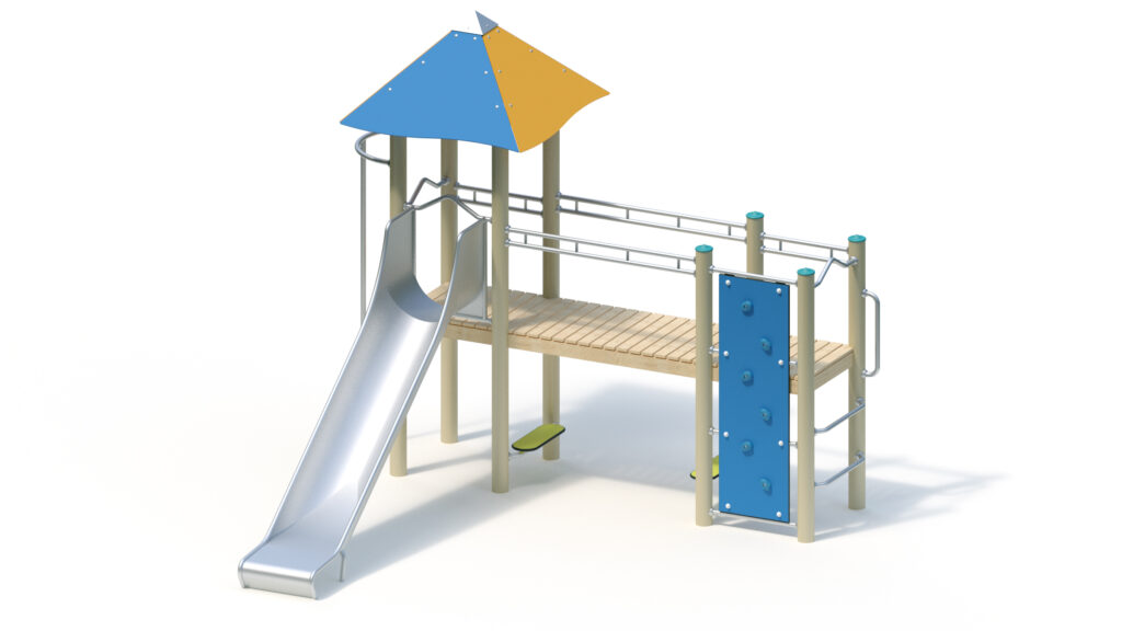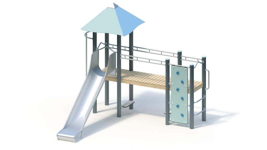 – Kletterwand aus höchst witterungsbeständiger HPL-Schichtstoffplatte, 20 mm, Befestigung zwischen Edelstahlrohren, mit einseitig aufgesetzten Freeclimbing-Elementen