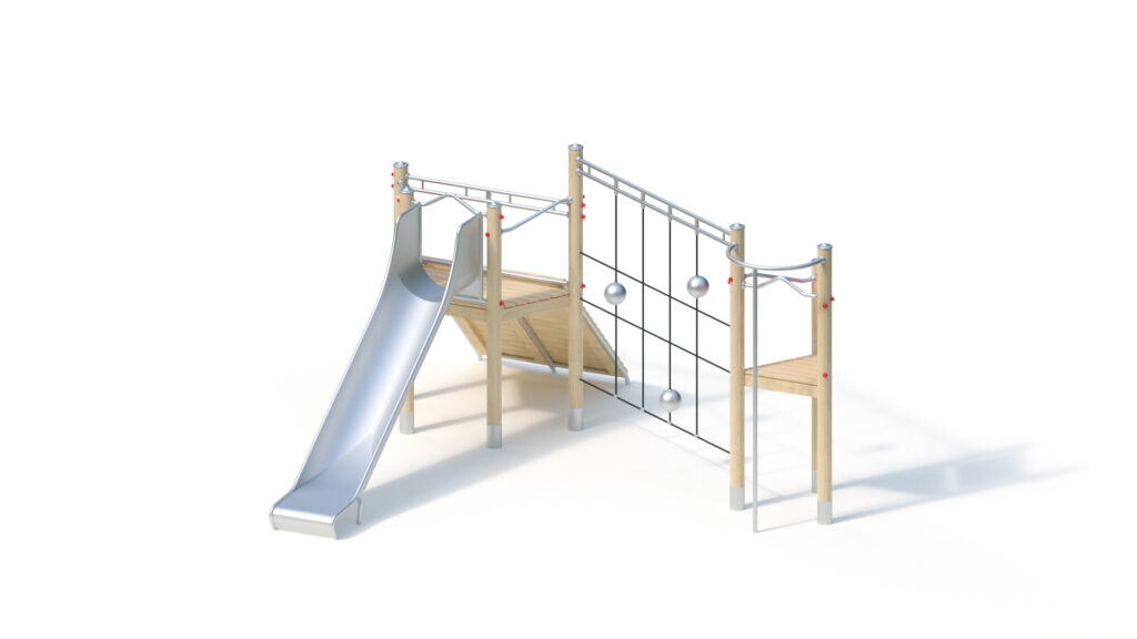 Standpfosten aus Edelstahl Ø 120 mm, mit nicht lösbaren Pfostenkappen aus Edelstahl abgedeckt. Anschluss der modularen Anbauteile an die Standpfosten durch solide und voll verschweißte Edelstahl-Einschweißhülsen ohne hervorstehende Verbindungselemente.