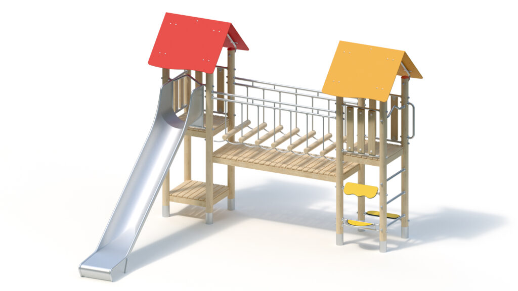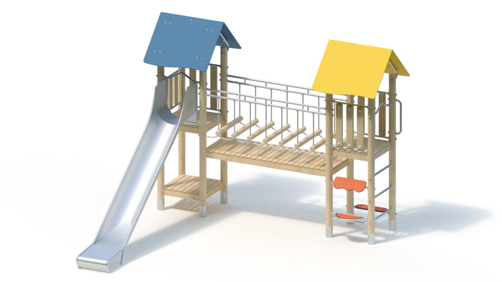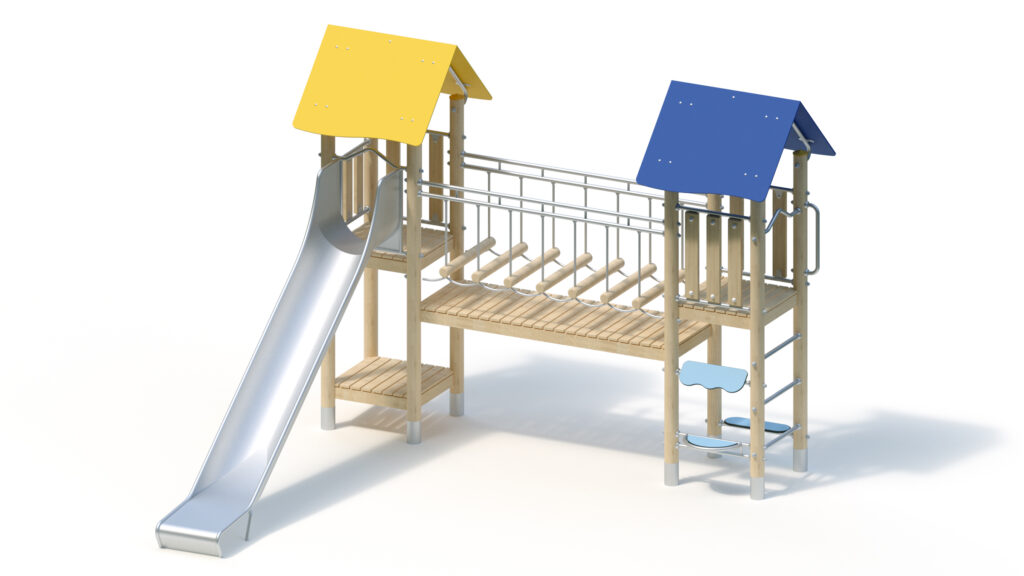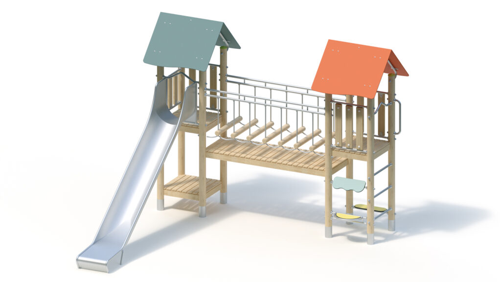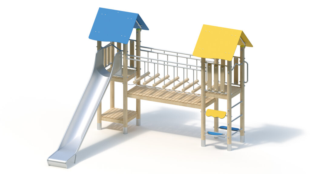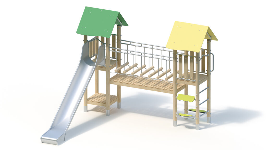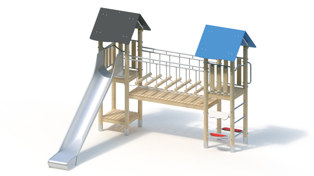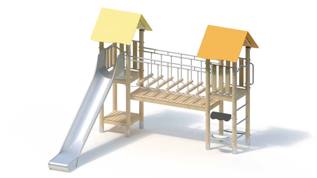 – Wackelbrücke an Tandemtraverse, Laufhölzer aus Robinie Ø 100 mm, Durchtrittschutz aus Robinienholz