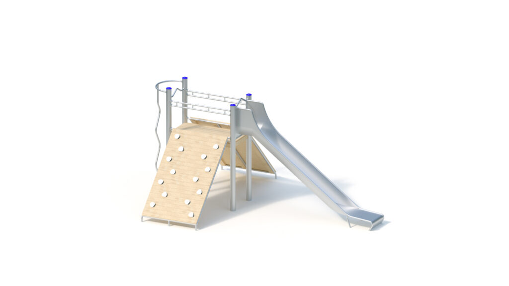 – Kletterwand aus höchst witterungsbeständiger farbiger HPL-Schichtstoffplatte, 20 mm, Rahmen aus Edelstahlrohr, 6 Kletteröffnungen