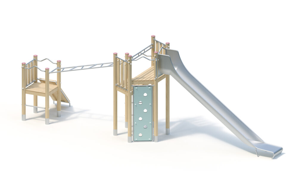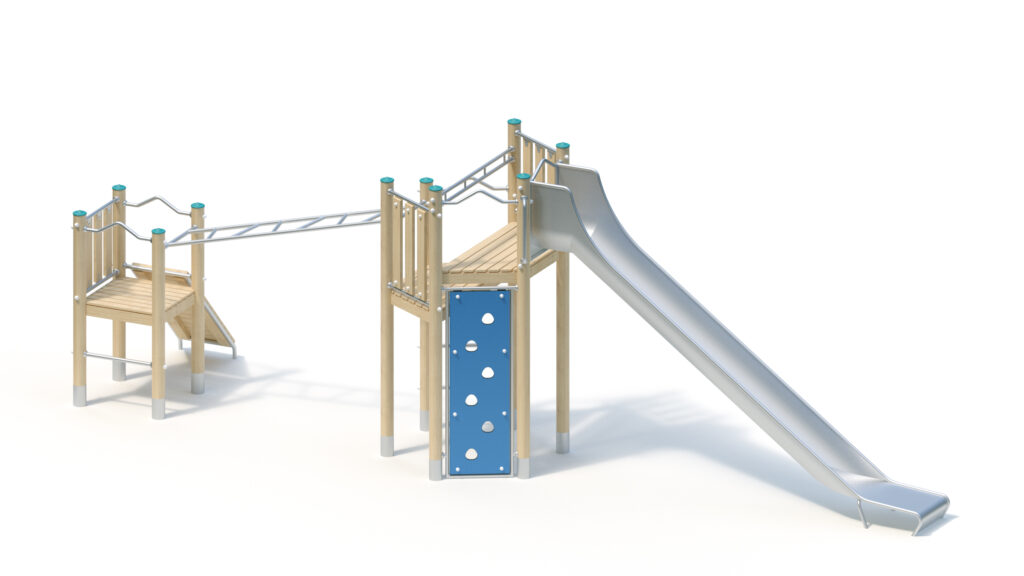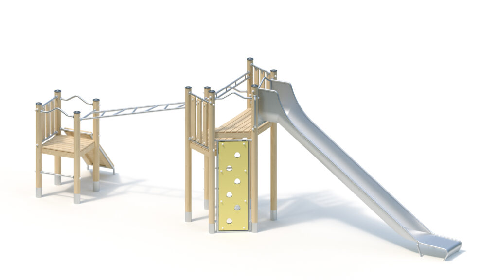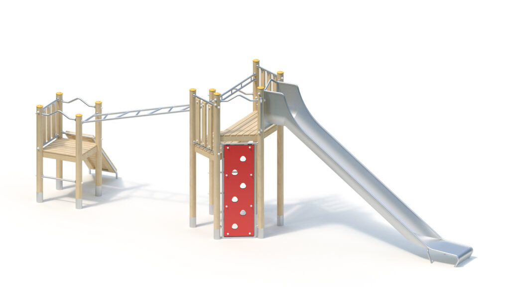 – Kraxelwand aus Robinienholz mit aufgesetzten Kletterelementen aus HPL-Schichtstoffplatte