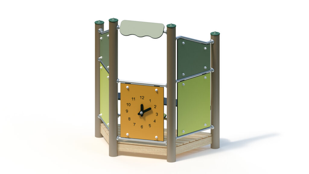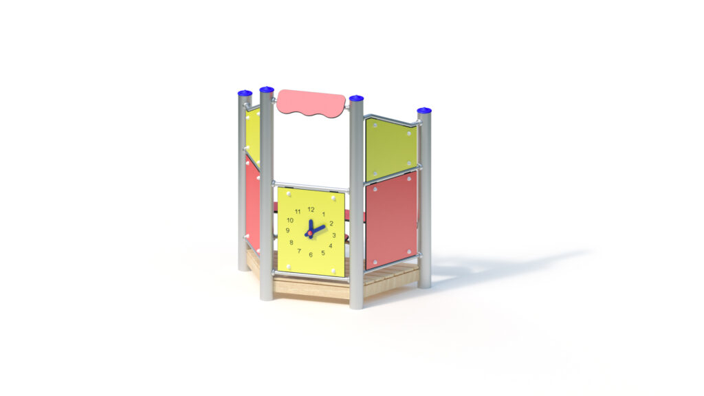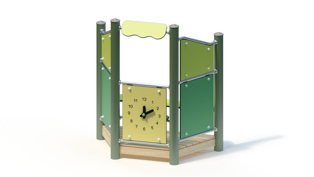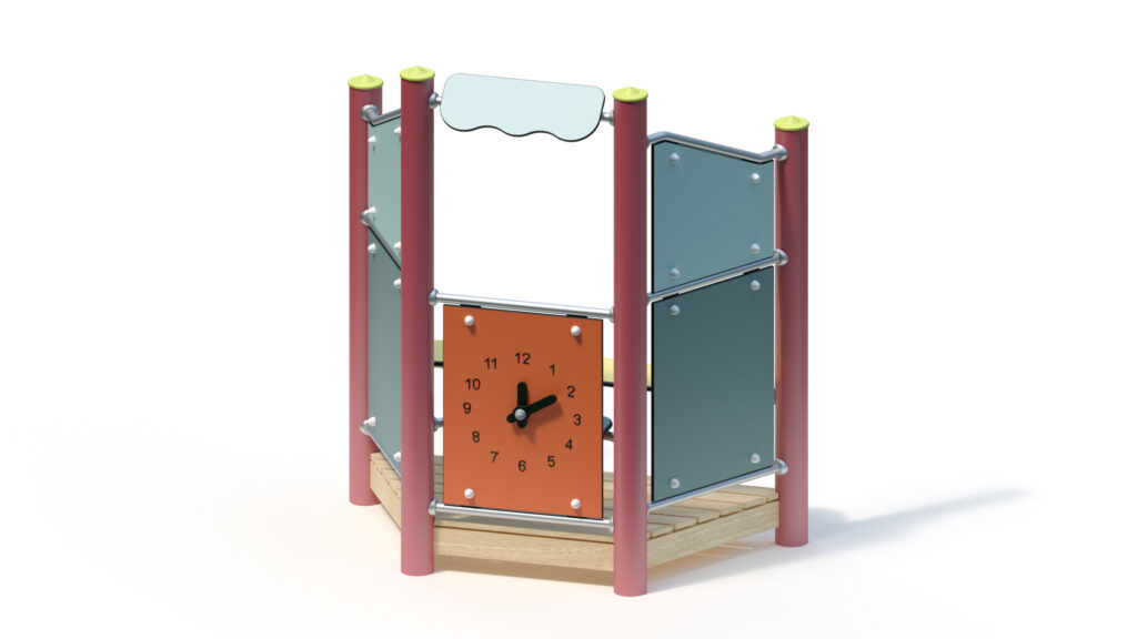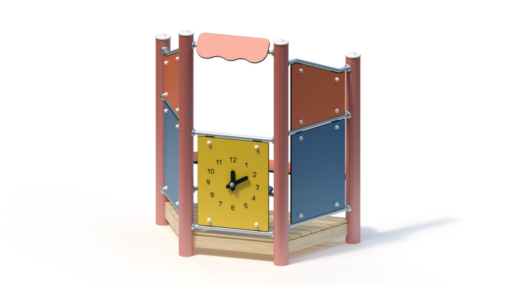 – infill panel made from highly weather-resistant coloured HPL, framed by stainless steel tubes Ø 33,7×2 mm, with clock hands made from coloured HPL panels for manual time adjustment