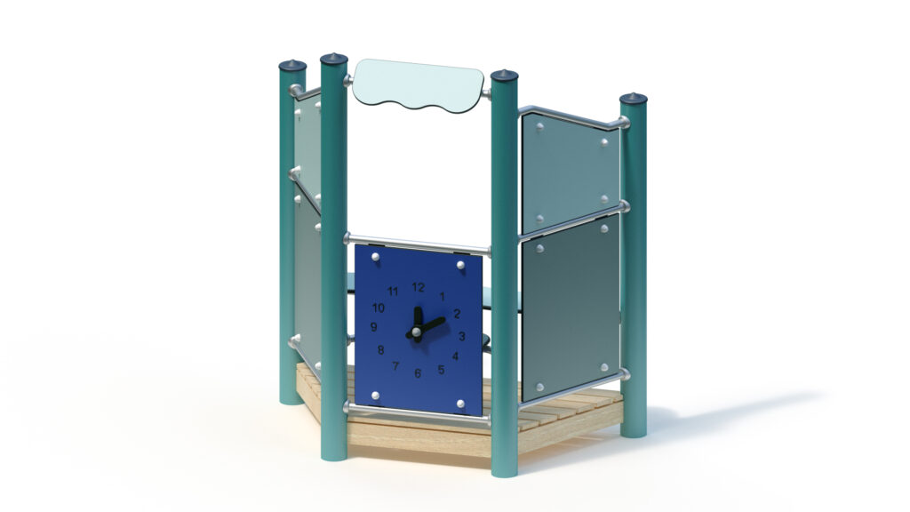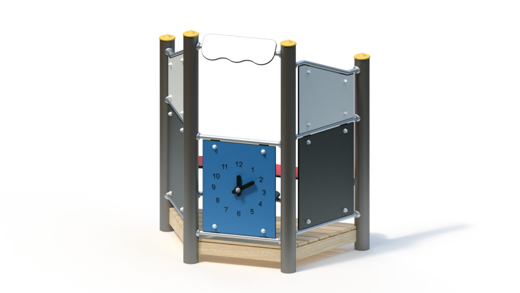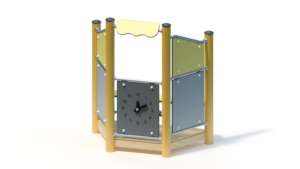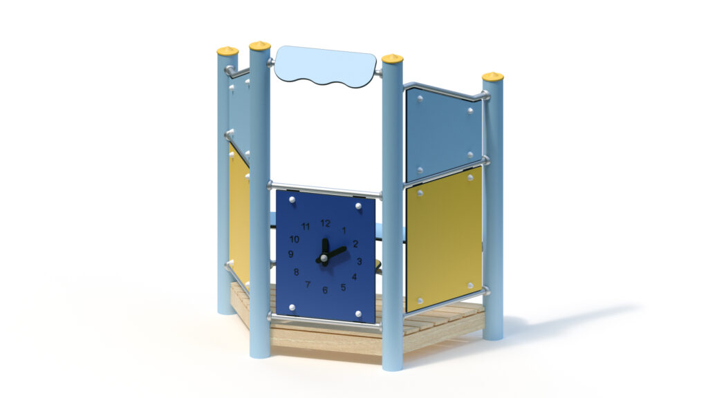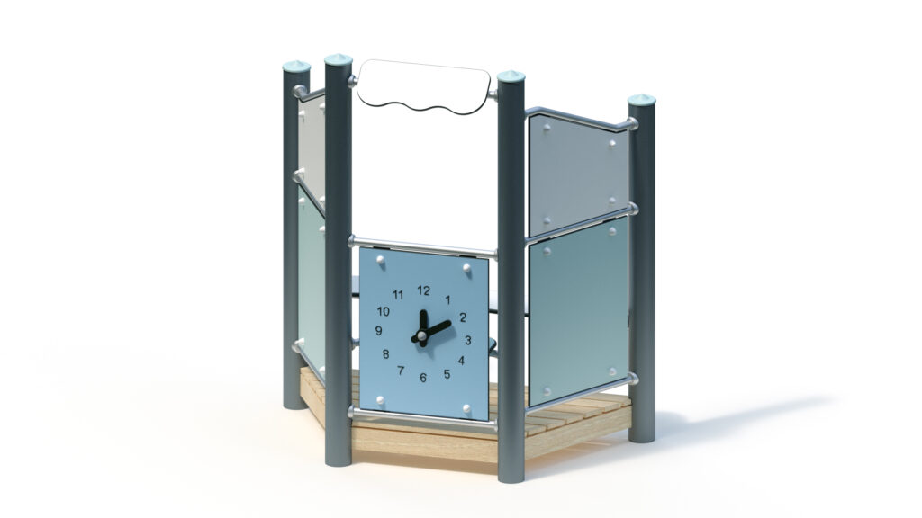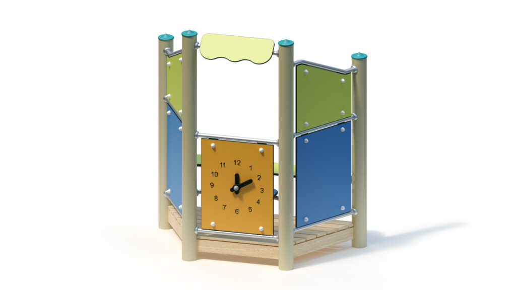 – infill panel made from highly weather-resistant coloured HPL, framed by stainless steel tubes Ø 33,7×2 mm, with clock hands made from coloured HPL panels for manual time adjustment