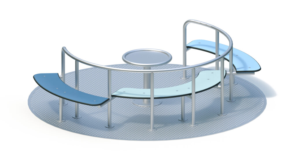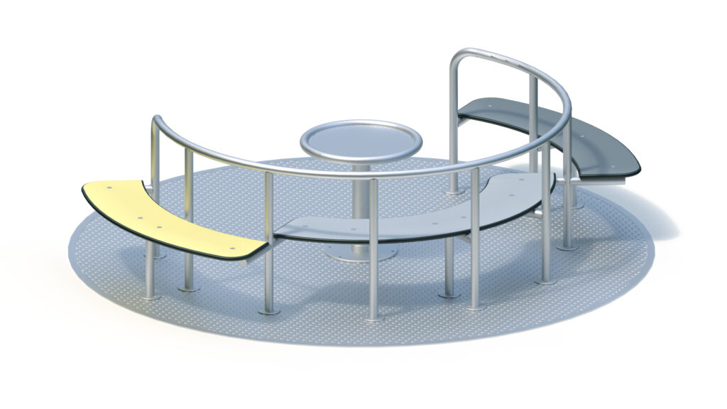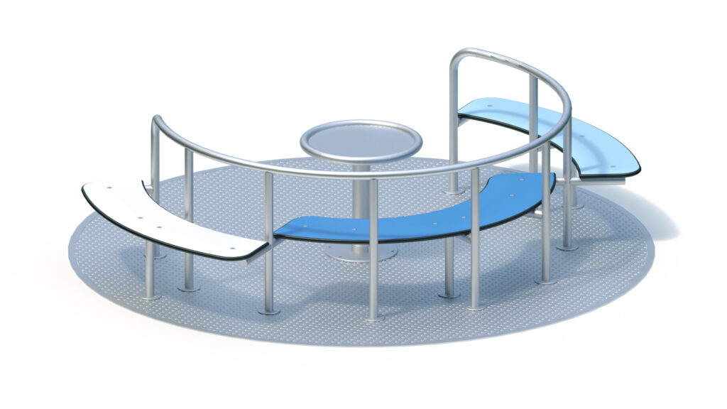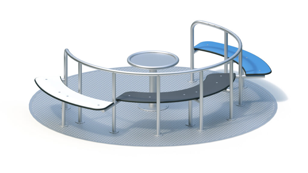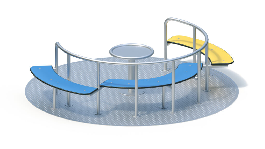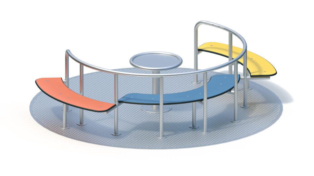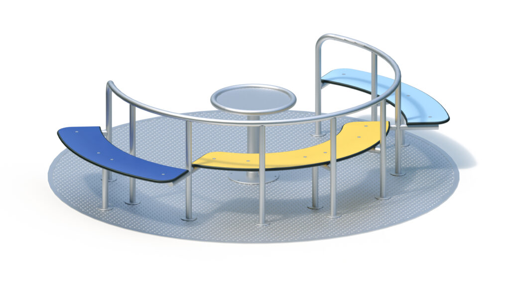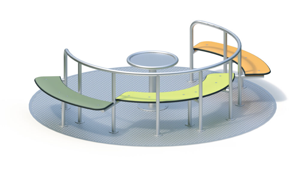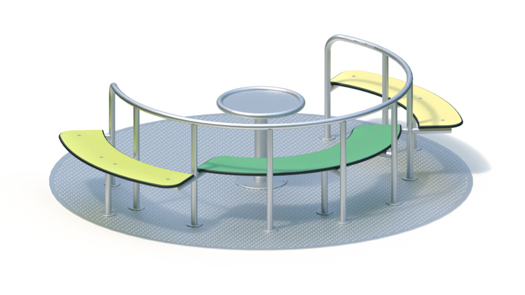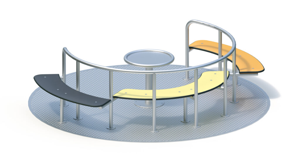 Karussell mit barrierefreiem, bodengleichem Zugang mit Handrad und Sitzfläche HPL-Schichtstoffplatte, 20 mm.