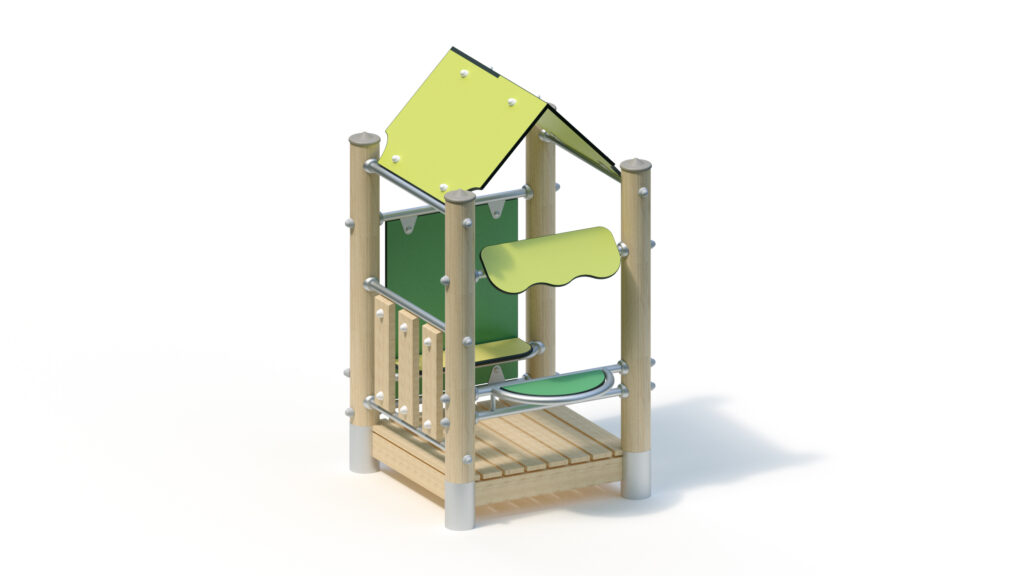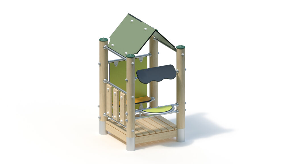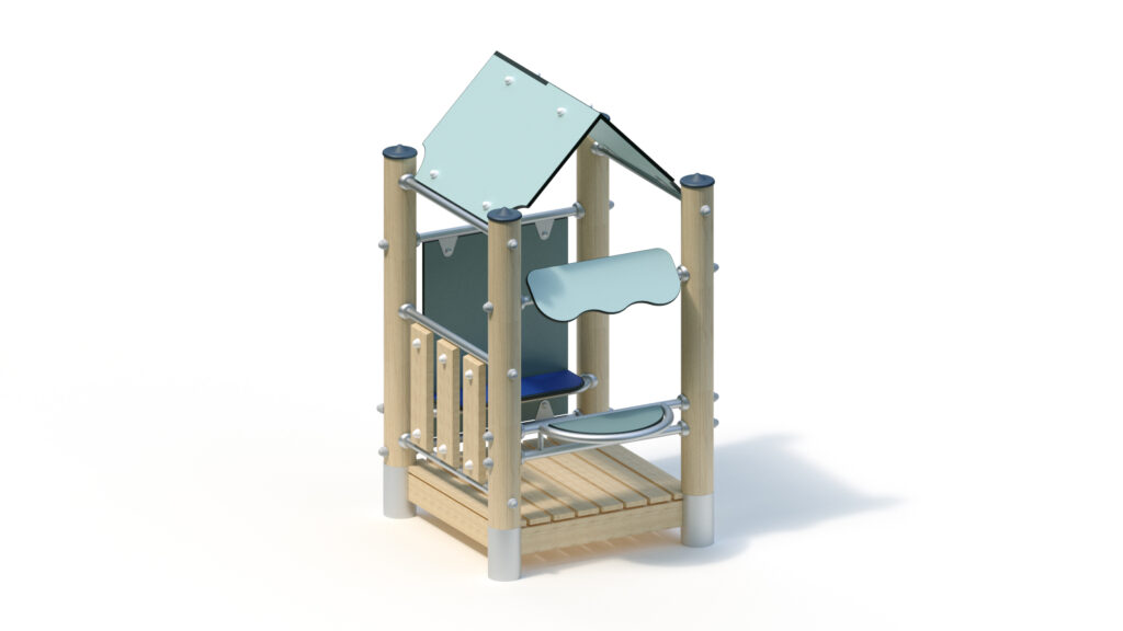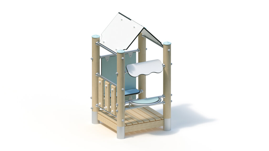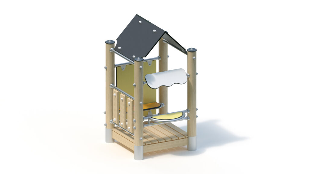 – saddle roof, 45° inclination, made from brown highly weather-resistant HPL panels, 13 mm thickness, fastening to stainless steel frame Ø 33,7 x 2 mm