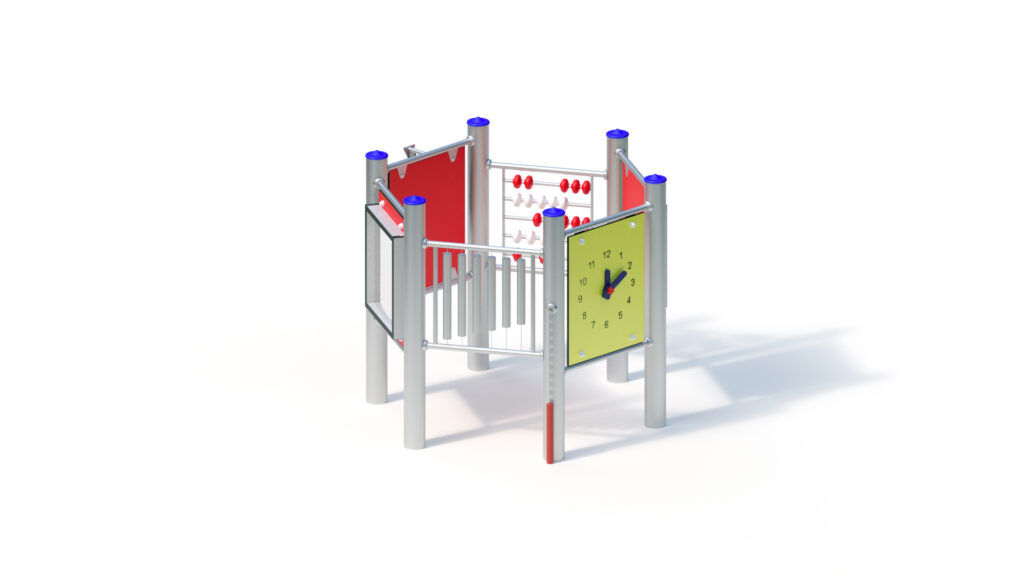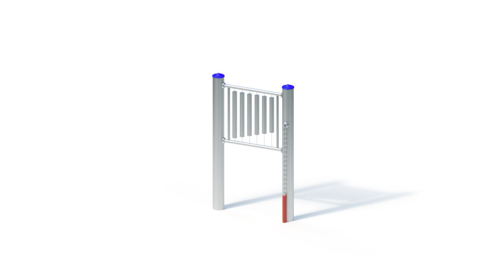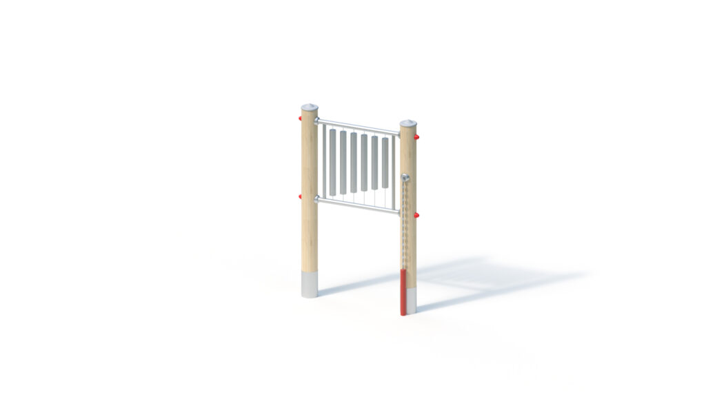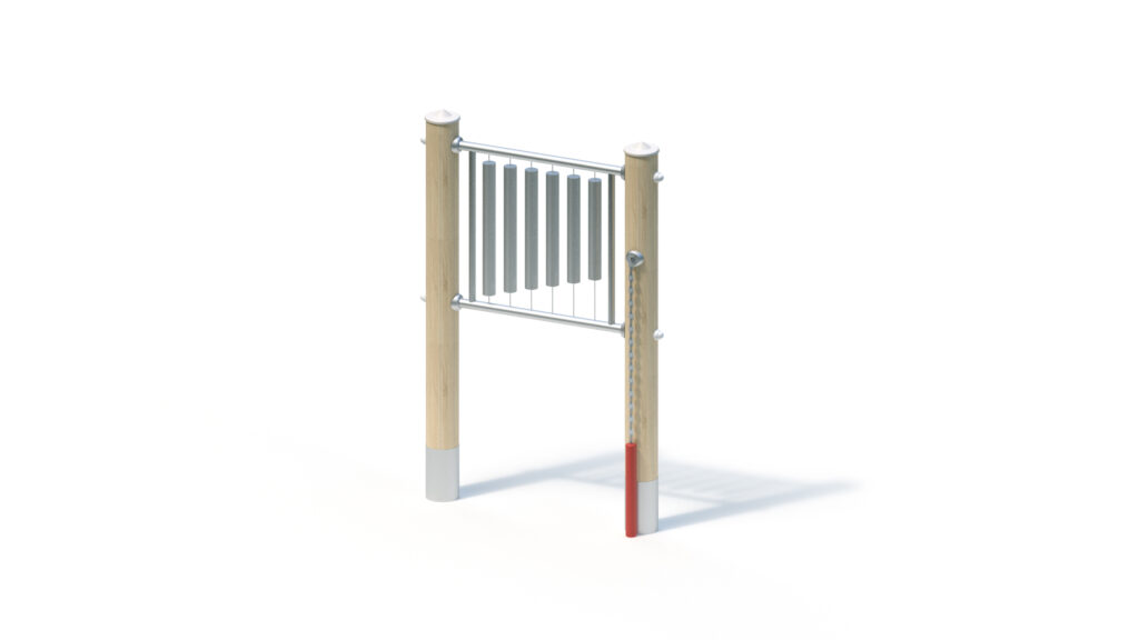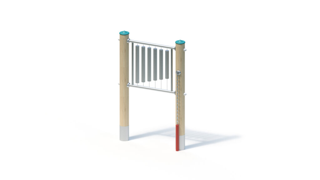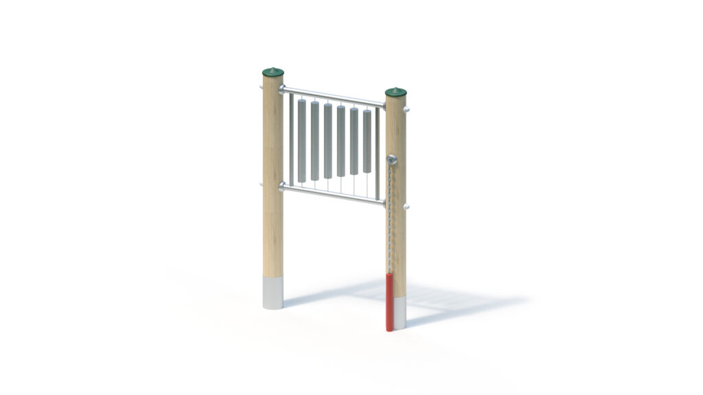 – Klangröhren aus Edelstahl, aufgehängt an Drahtseilen. Befestigung zwischen Edelstahlrohren Ø 33,7 x 2 mm. Inkl. Klangschlegel aus PVC, mittels Edelstahlkette befestigt an einem Standpfosten.