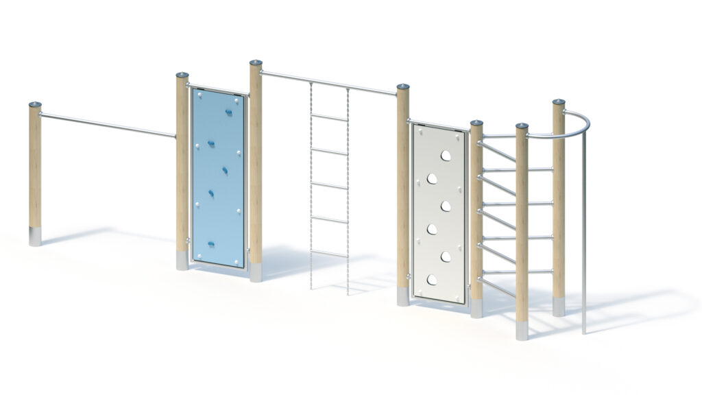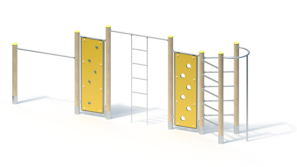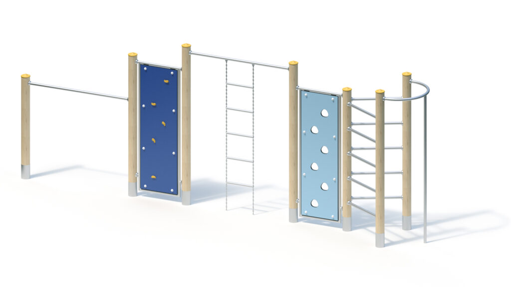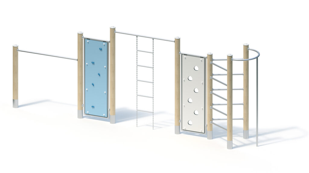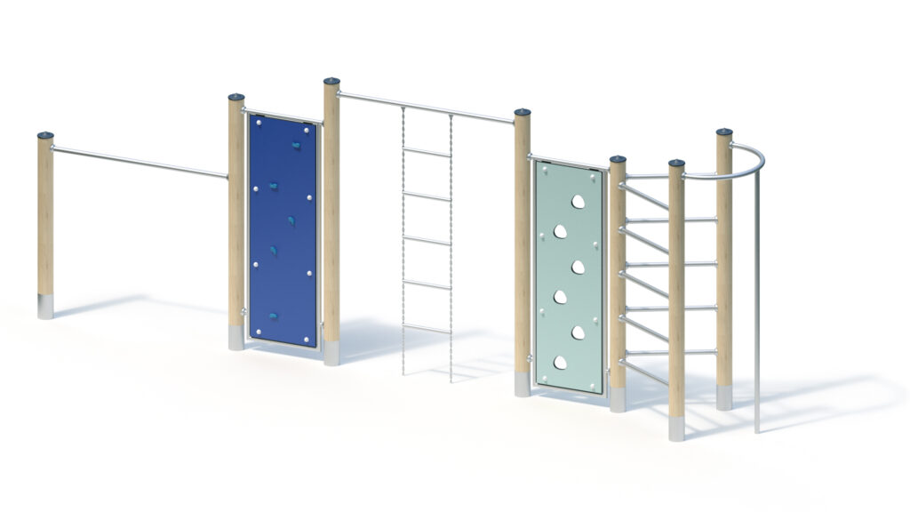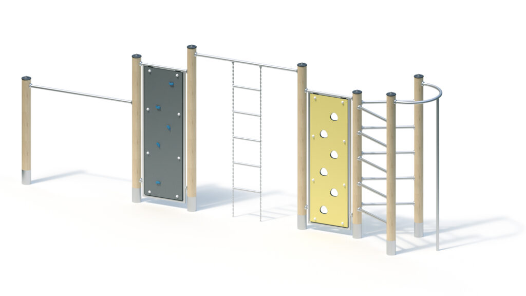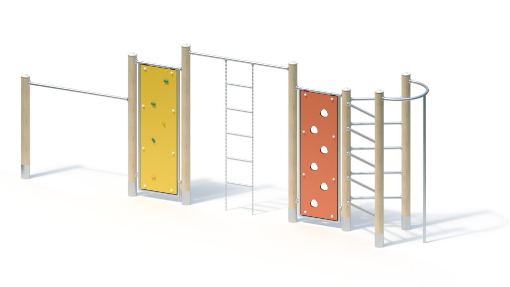 – Kletterwand aus höchst witterungsbeständiger HPL-Schichtstoffplatte (rot), 20 mm, Rahmen aus Edelstahlrohr, mit beidseitig aufgesetzten Freeclimbing-Elementen