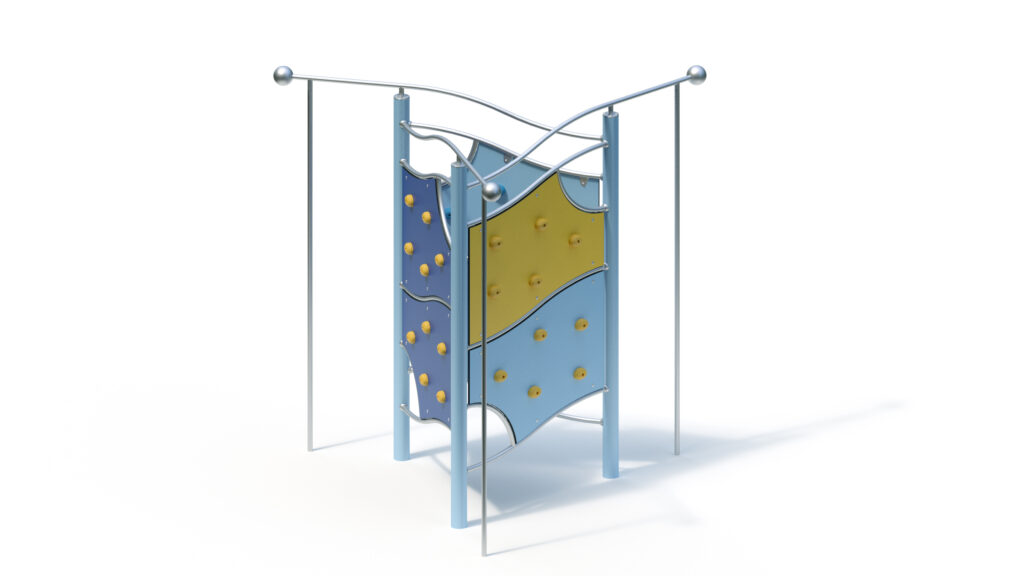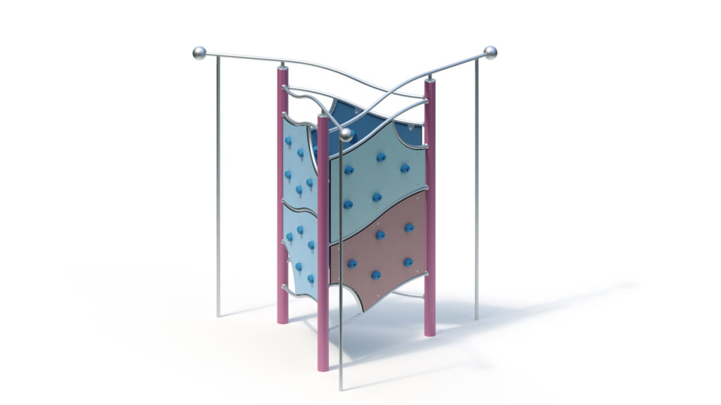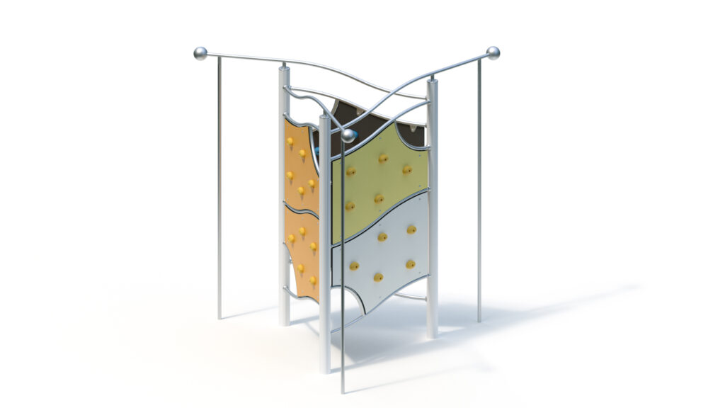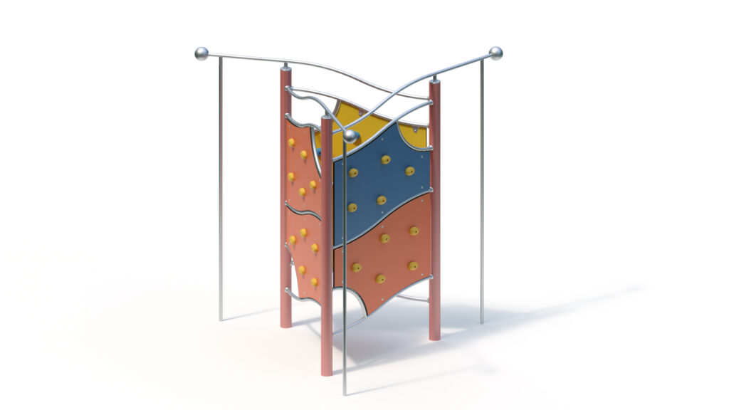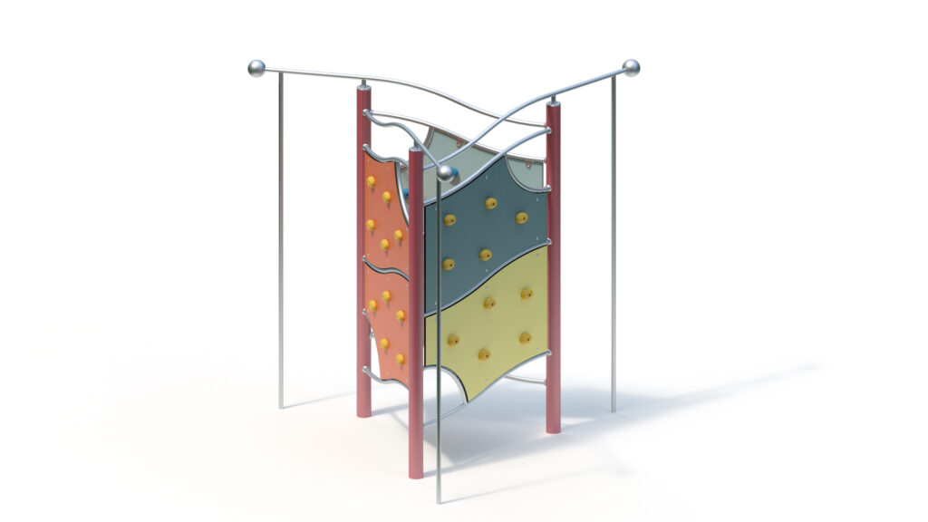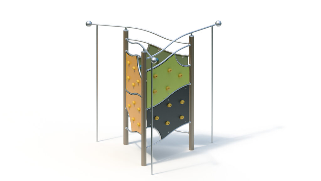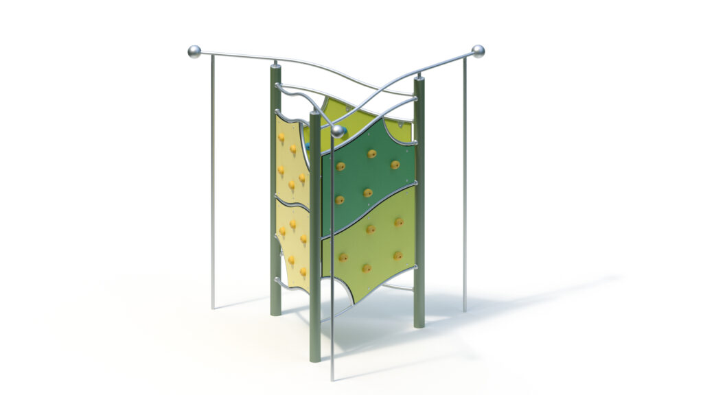 – Kletterwandplatten, geschwungen 1,60 m, aus höchst witterungsbeständiger HPL-Schichtstoffplatte, rot, gelb und grün, in einem Rahmen aus Edelstahlrohr; mit beidseitig aufgeschraubten