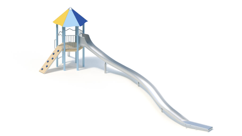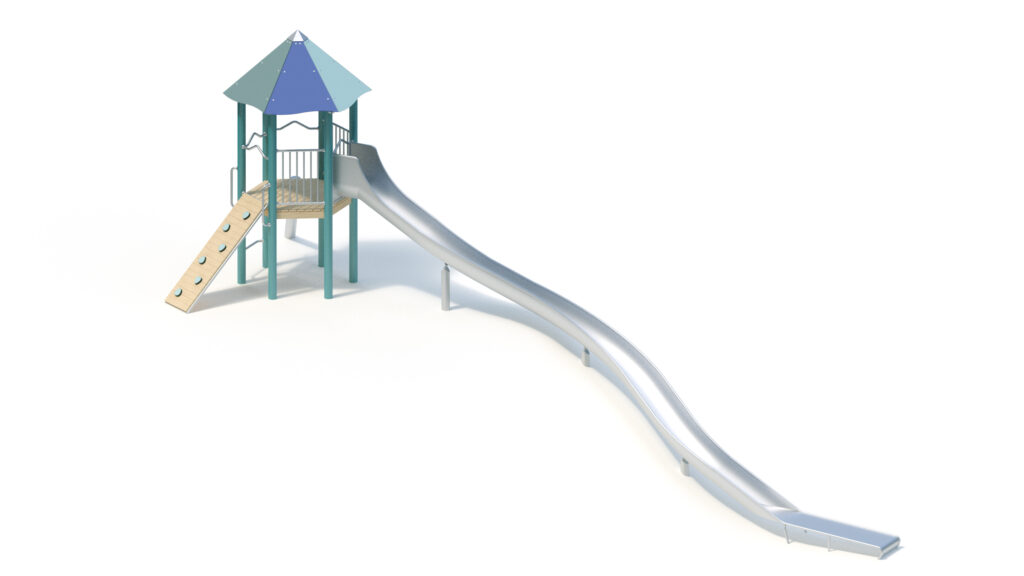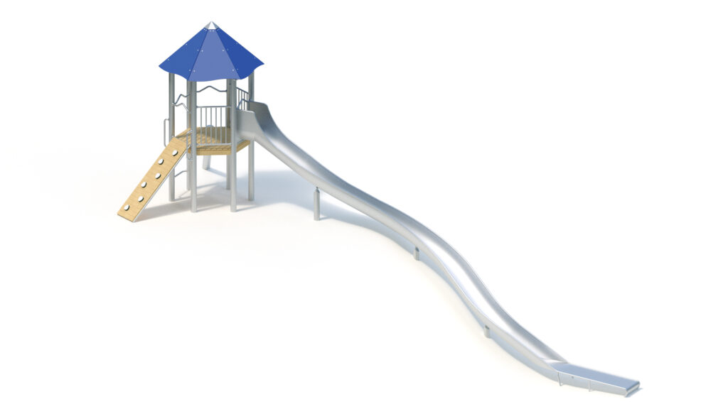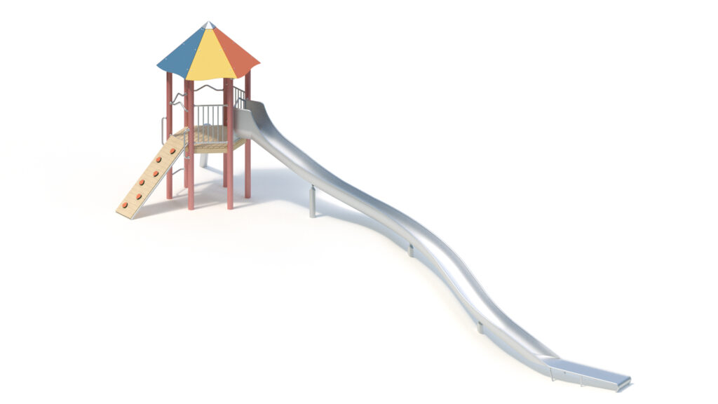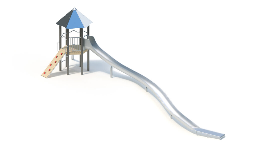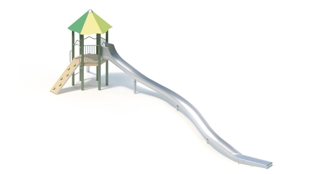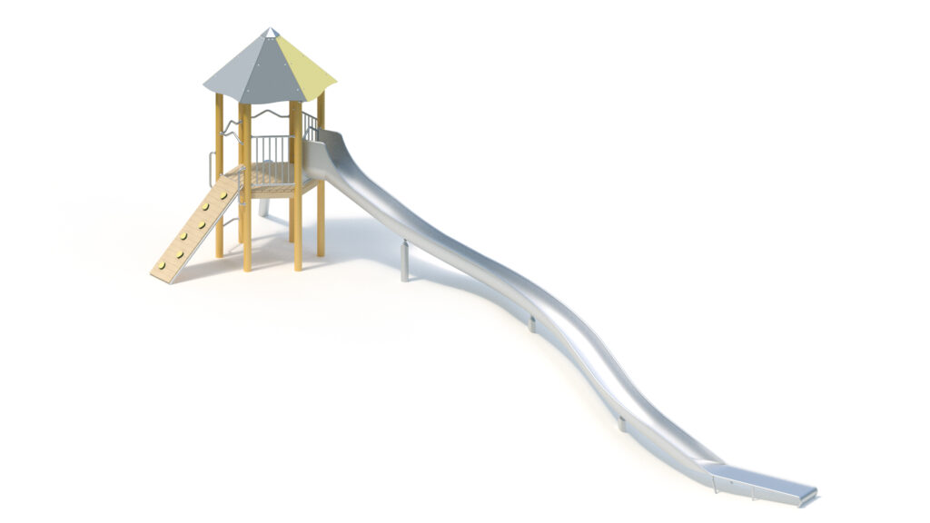 – Anbau-Muldenrutsche, 0,60 m breit, durch Muldenform besonders geräuscharm, aus Transportgründen zu einer zweiteiligen Rutsche verschweißt, Blechdicke: 2,5 mm, mit abrollverhindernder Absturzsicherung über dem Einsitzteil, drei Stützpfosten für die Kurvenbereiche, Befestigungsflansch am Auslaufteil, jeweils gefertigt aus Edelstahl, inkl. entsprechenden Verbindungsflanschen, um die Montage vor Ort zu erleichtern