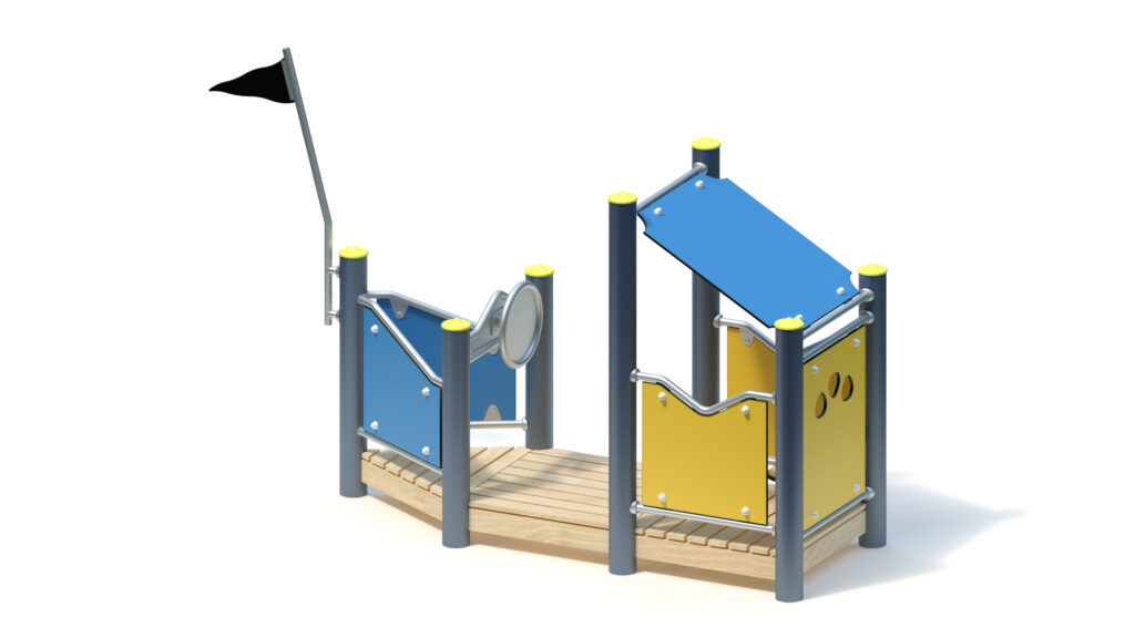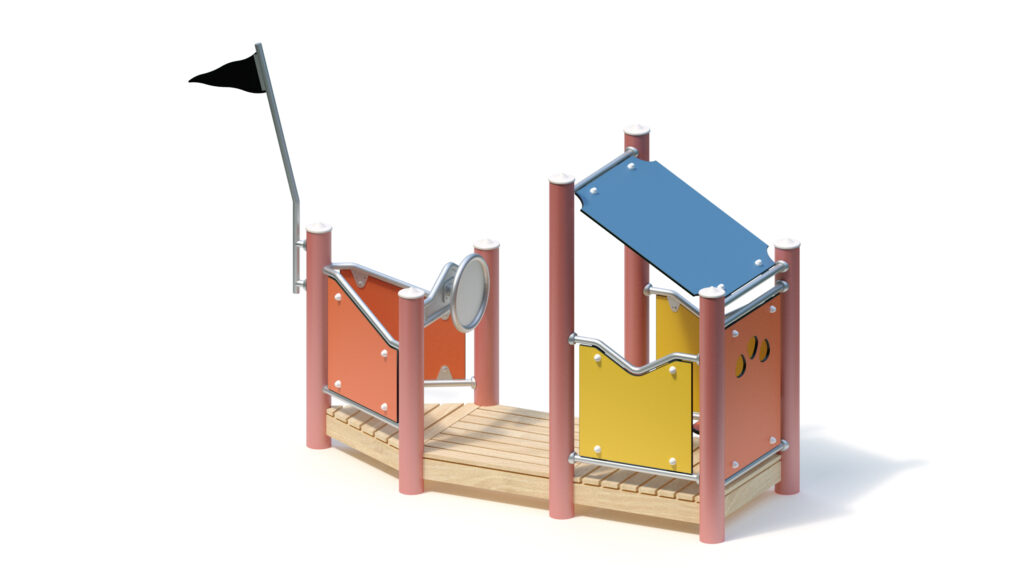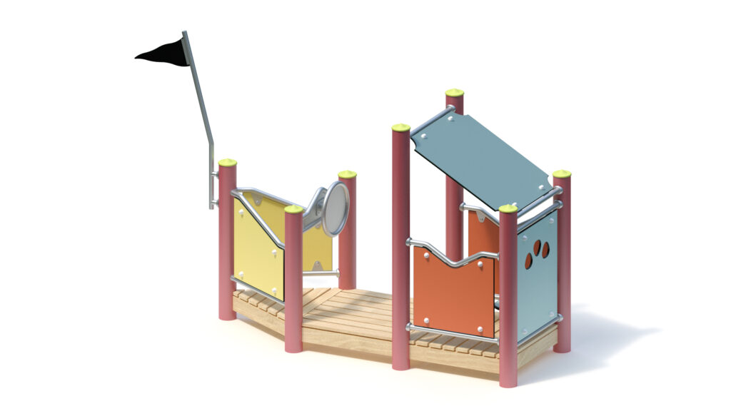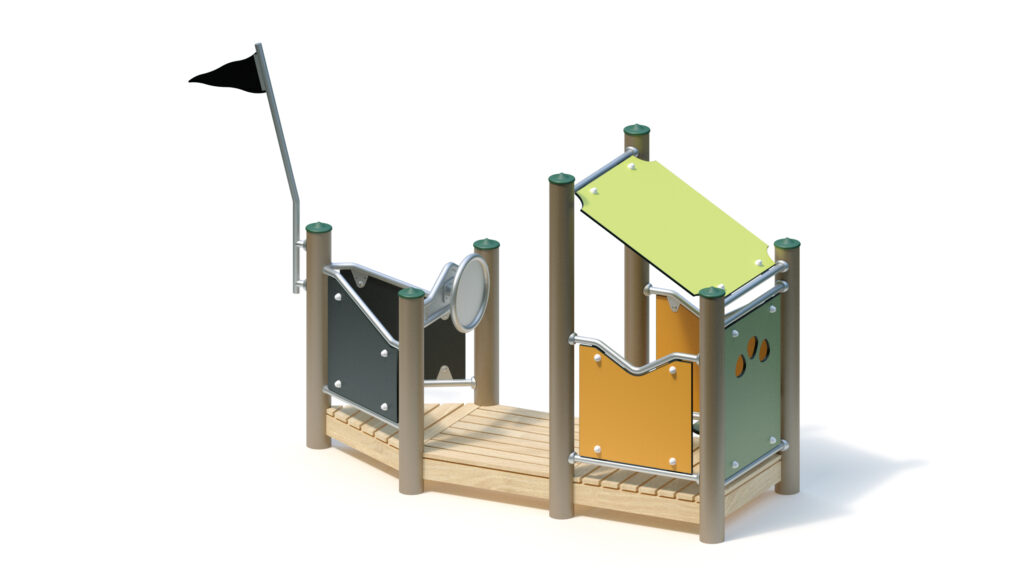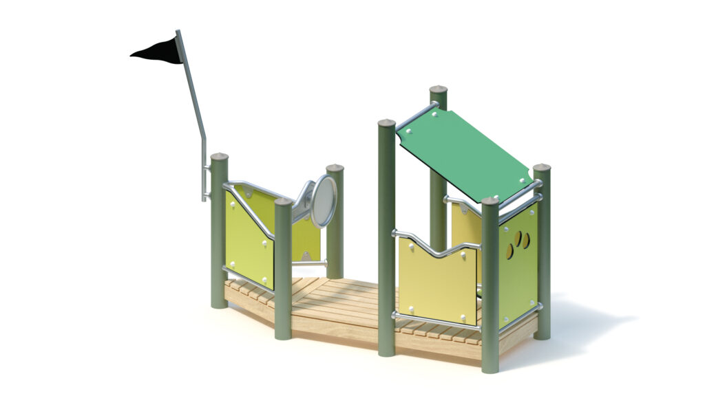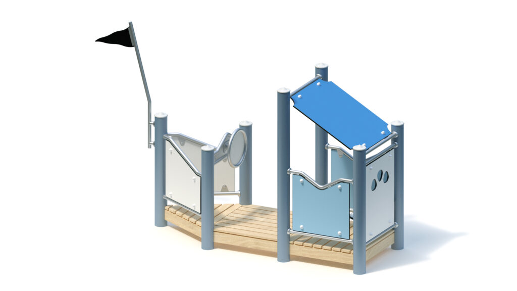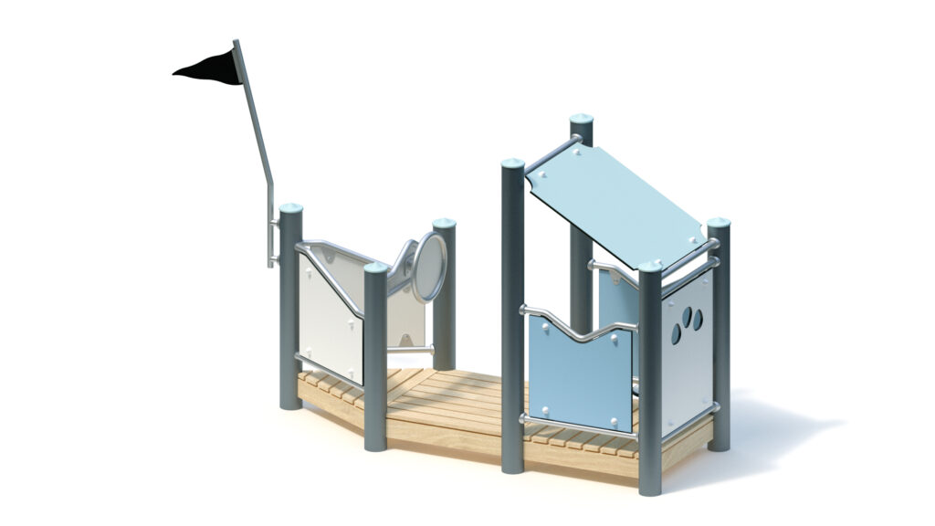 Standpfosten aus Edelstahlrohr Ø 120 mm mit nicht lösbaren Pfostenkappen aus Edelstahl abgedeckt. Anschluss der modularen Anbauteile an die Standpfosten durch solide und voll verschweißte Edelstahl-Einschweißhülsen ohne hervorstehende Verbindungselemente.
