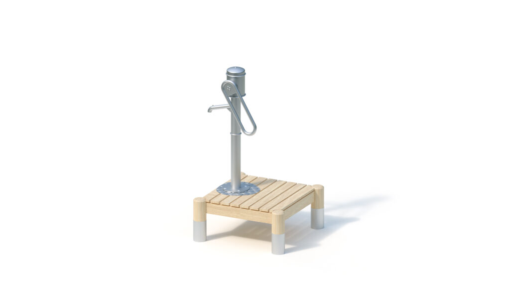 Platform made of boards, 30 mm thick and surrounding squared timber beams 45 x 100 mm. The dried sawn timber from Robinia is planed, chamfered and free from rotting branches. Non-positive floor mounting by special stainless steel brackets with a continuous bolt connection. Pump platform additionally with profiled stainless steel plate.