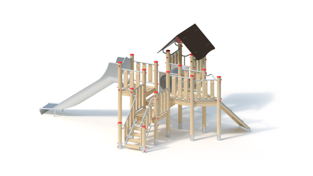 Laminated Robinia timber Ø 120 mm with cylindrical milling. End-grain surfaces are covered by non-detachable protective stainless steel caps. Stainless steel tubular pedestal for concrete-cast foundation and for fixed mounting to round Robinia posts, Ø 120 mm, below playing surface.