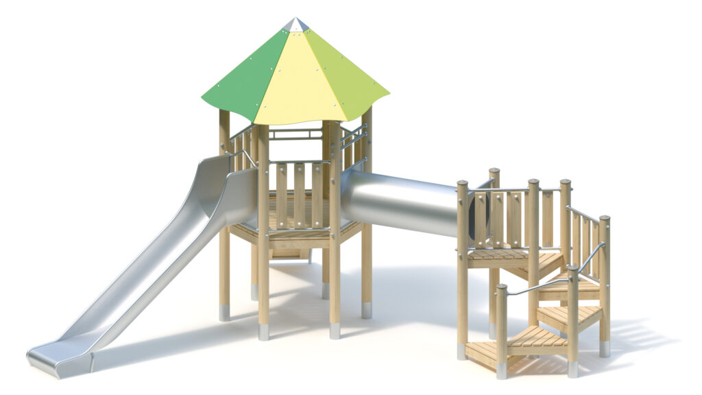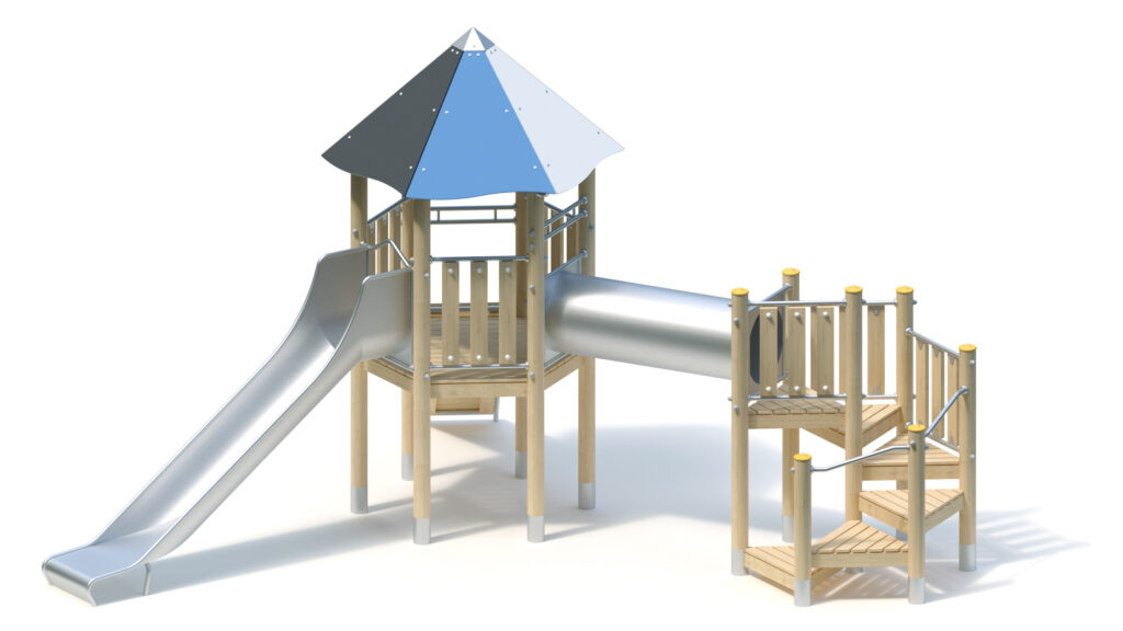 Laminated Robinia timber Ø 120 mm with cylindrical milling. End-grain surfaces are covered by non-detachable protective stainless steel caps. Stainless steel tubular pedestal for concrete-cast foundation and for fixed mounting to round Robinia posts, Ø 120 mm, below playing surface.