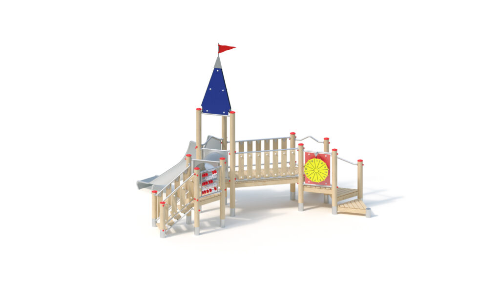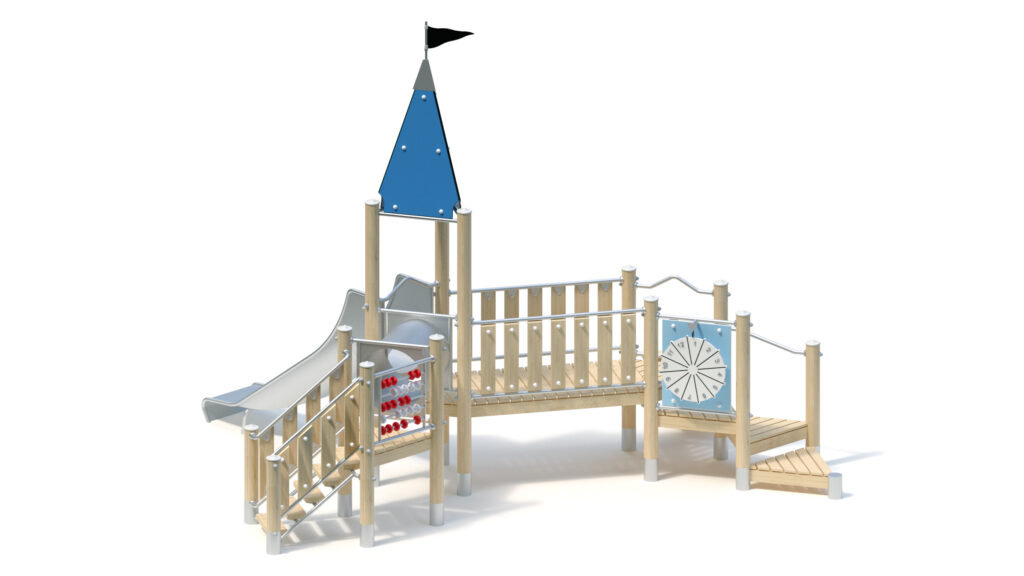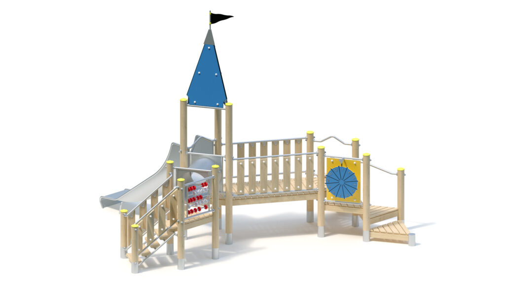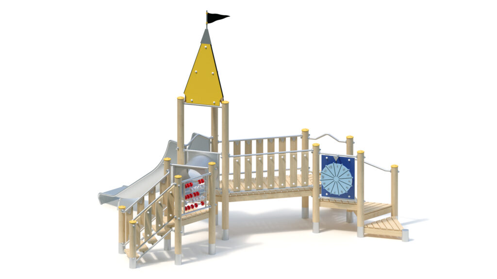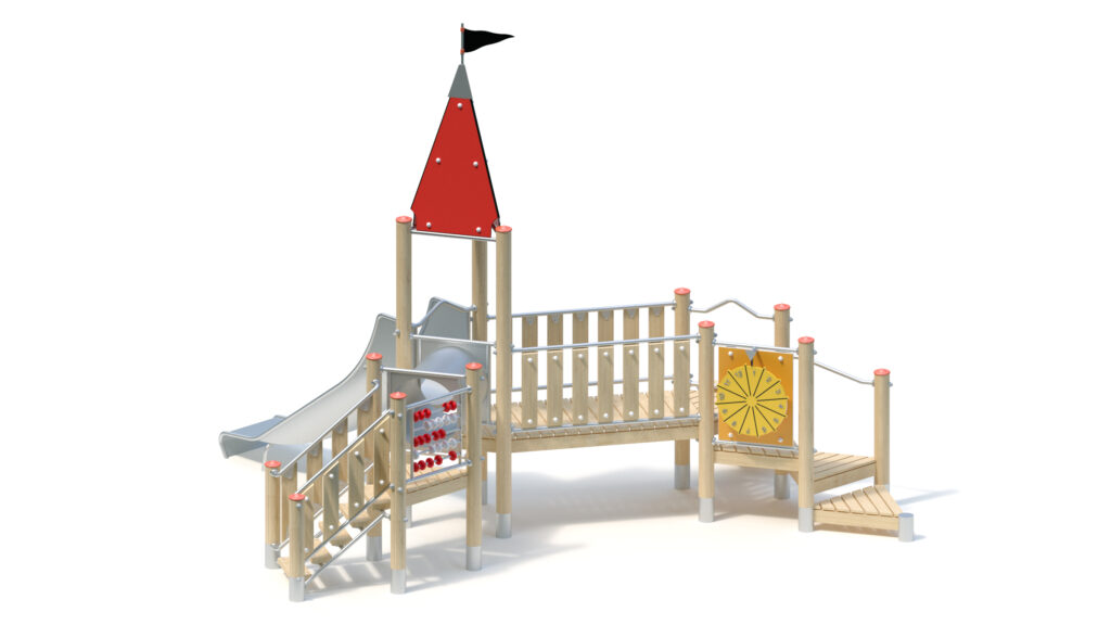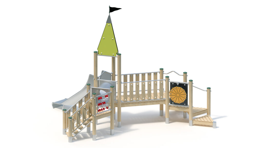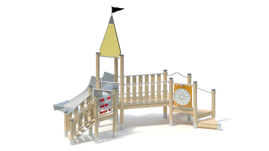 Laminated Robinia timber Ø 120 mm with cylindrical milling. End-grain surfaces are covered by non-detachable protective stainless steel caps. Stainless steel tubular pedestal for concrete-cast foundation and for fixed mounting to round Robinia posts, Ø 120 mm, below playing surface.