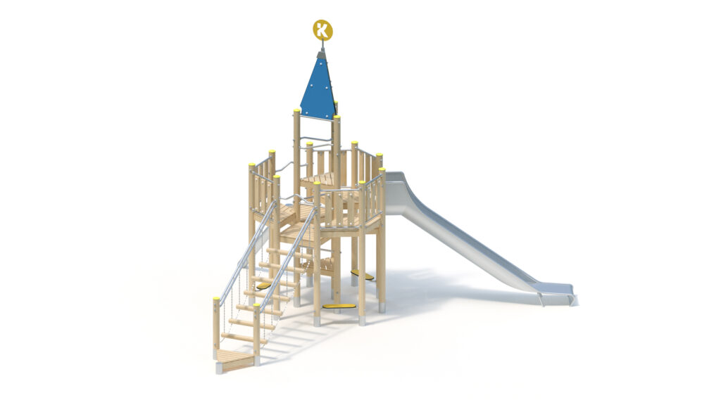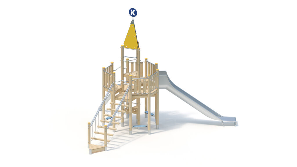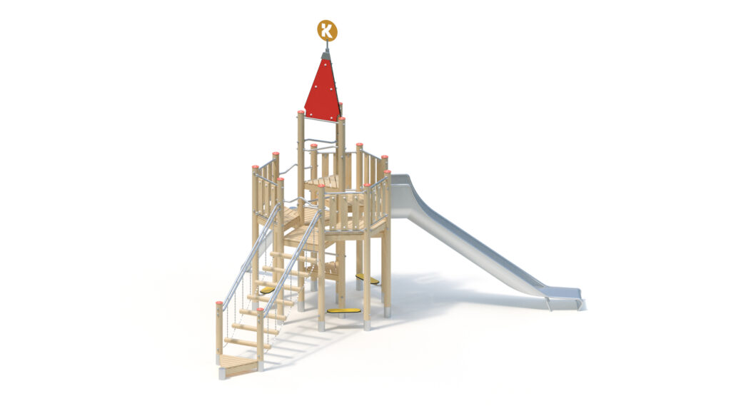 Laminated Robinia timber Ø 120 mm with cylindrical milling. End-grain surfaces are covered by non-detachable protective stainless steel caps. Stainless steel tubular pedestal for concrete-cast foundation and for fixed mounting to round Robinia posts, Ø 120 mm, below playing surface.
