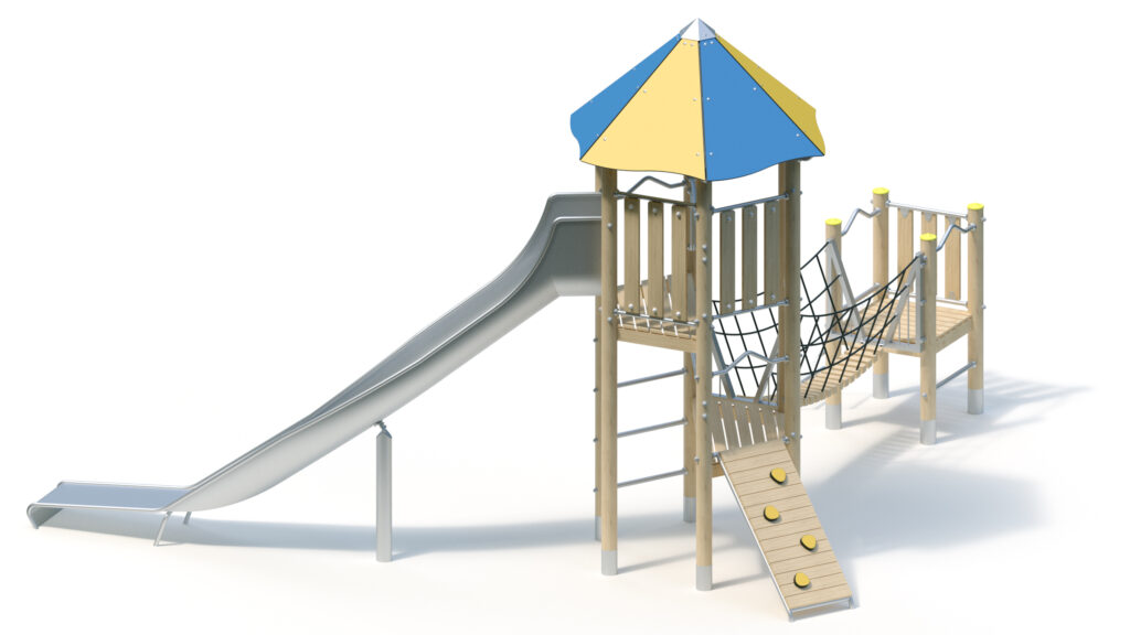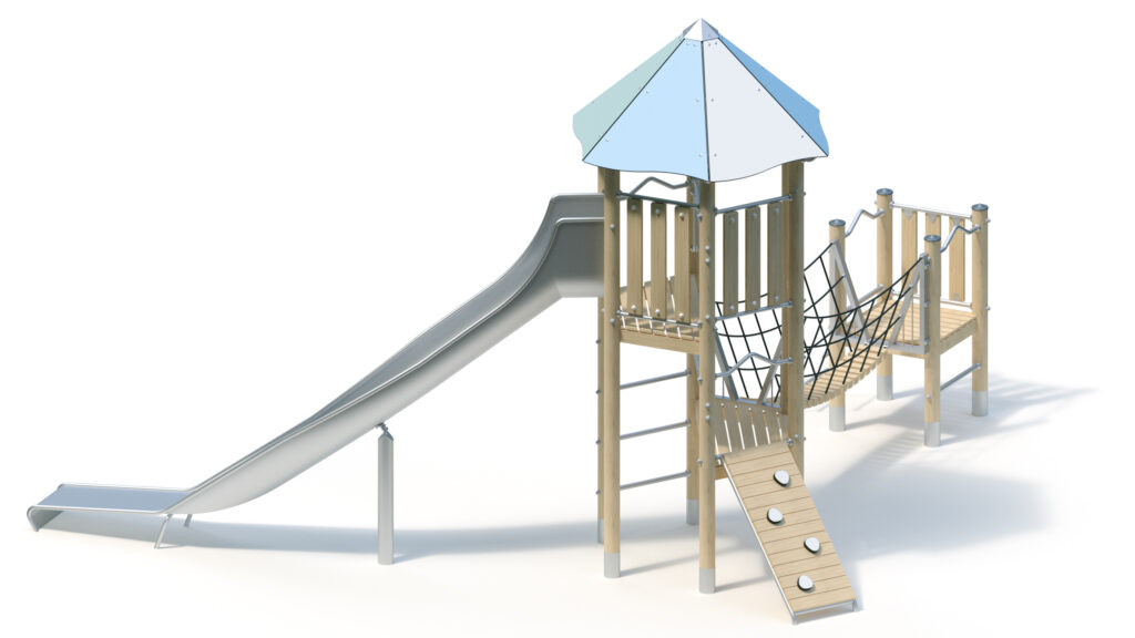 Laminated Robinia timber Ø 120 mm with cylindrical milling. End-grain surfaces are covered by non-detachable protective stainless steel caps. Stainless steel tubular pedestal for concrete-cast foundation and for fixed mounting to round Robinia posts, Ø 120 mm, below playing surface.