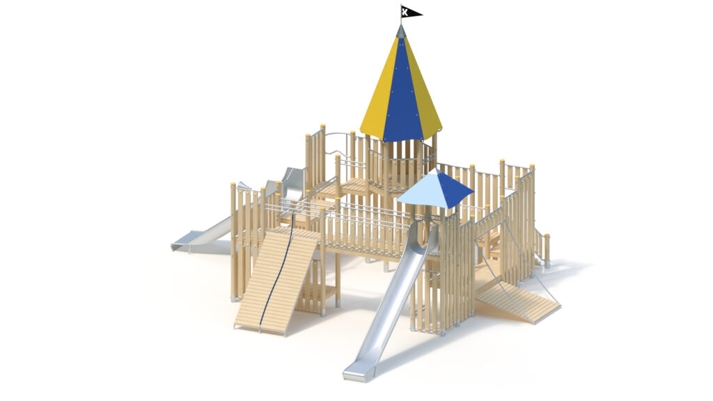 Laminated Robinia timber Ø 120 mm with cylindrical milling. End-grain surfaces are covered by non-detachable protective stainless steel caps. Stainless steel tubular pedestal for concrete-cast foundation and for fixed mounting to round Robinia posts, Ø 120 mm, below playing surface.