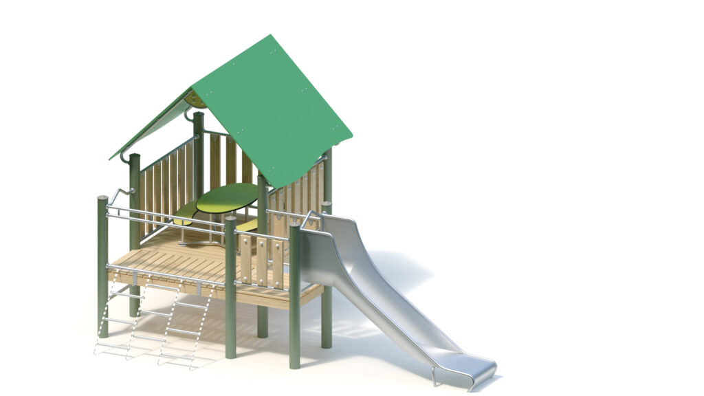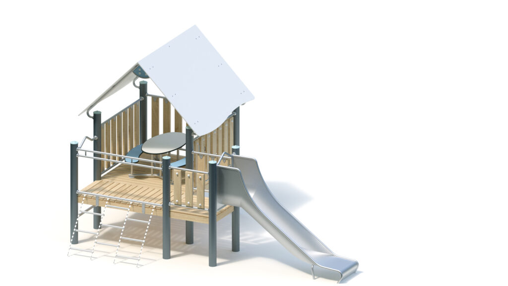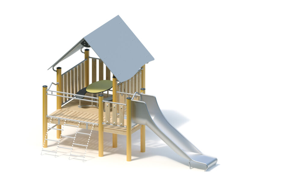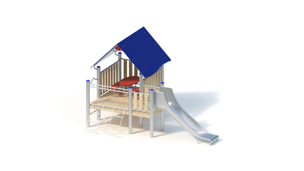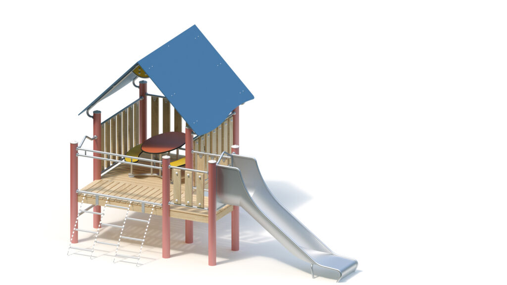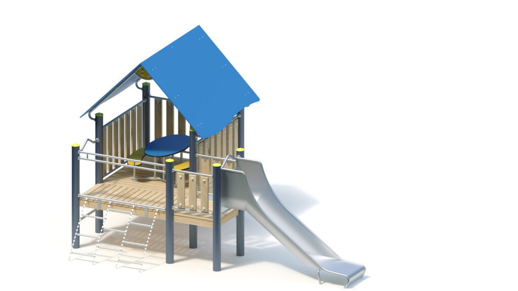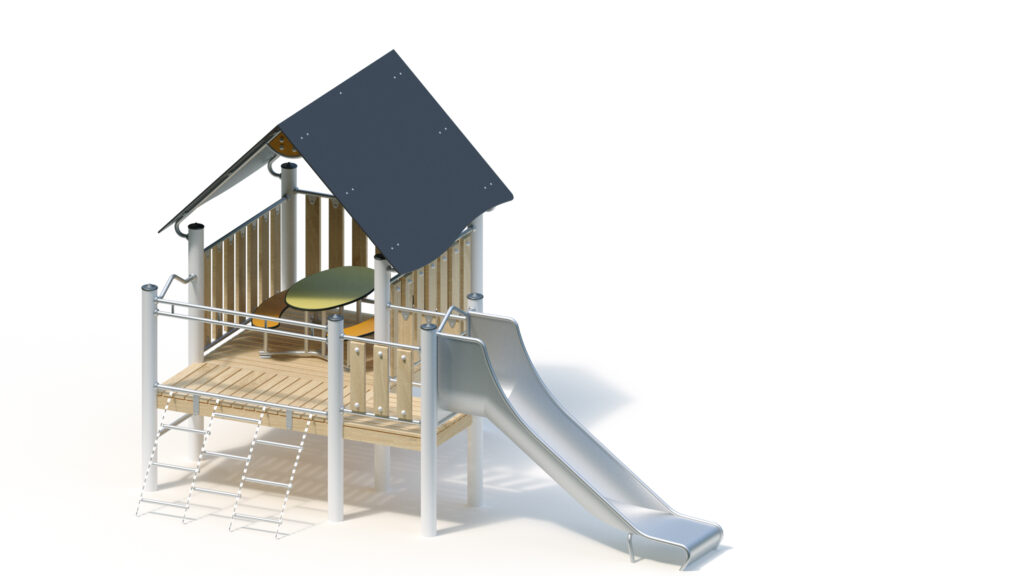 – gable roof, 45° inclination made from highly weather-resistant HPL panels (royal blue), 13 mm thickness, fastening to stainless steel frame Ø 33,7 x 2 mm