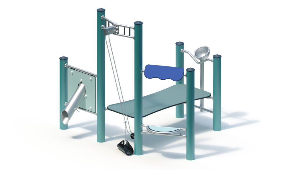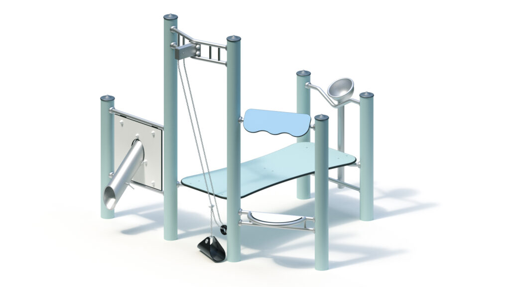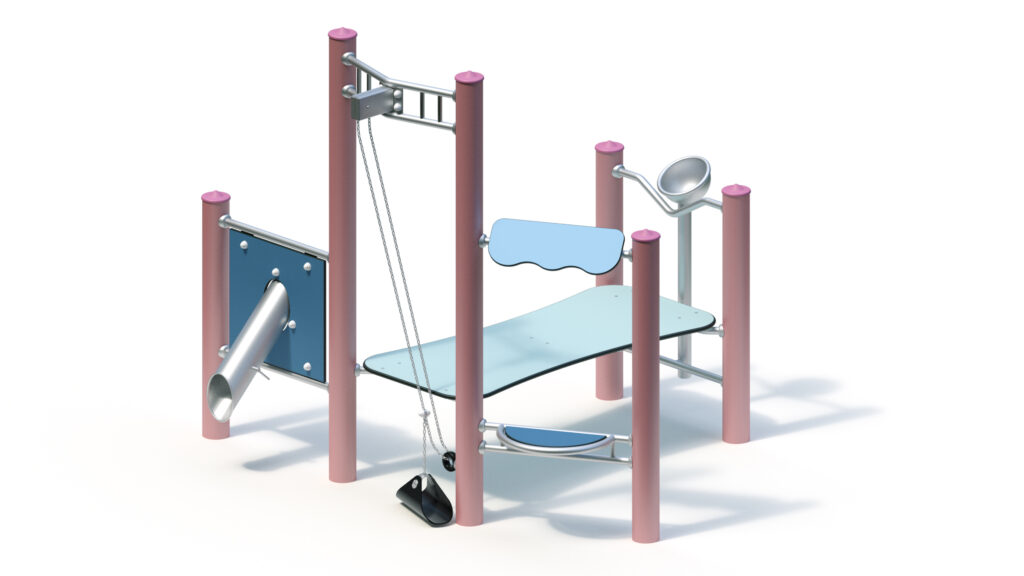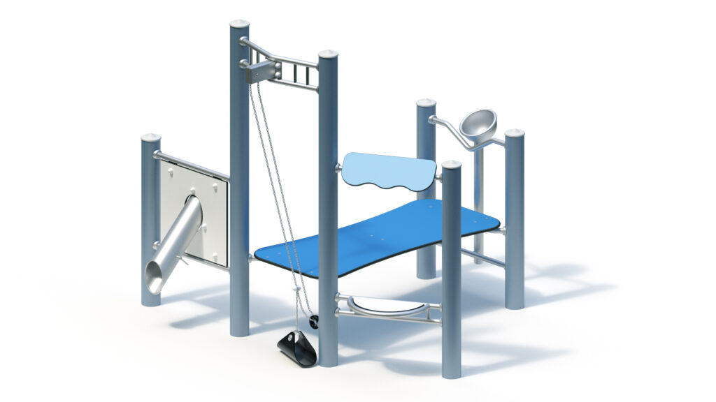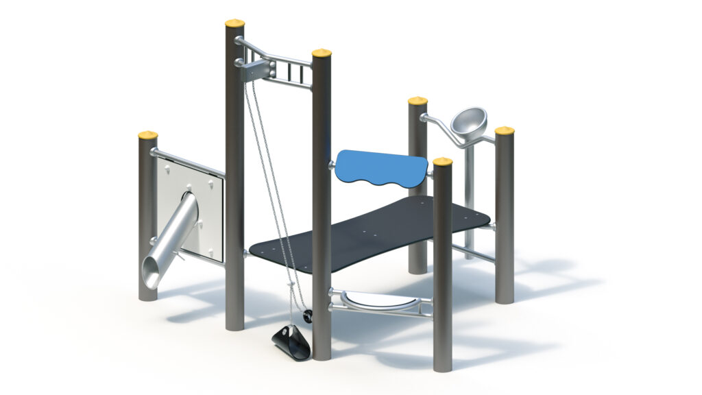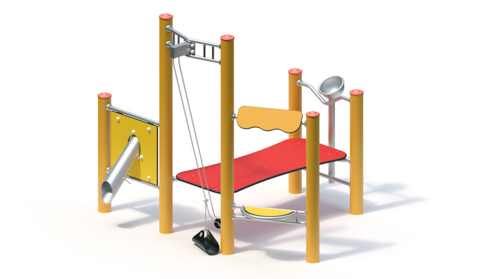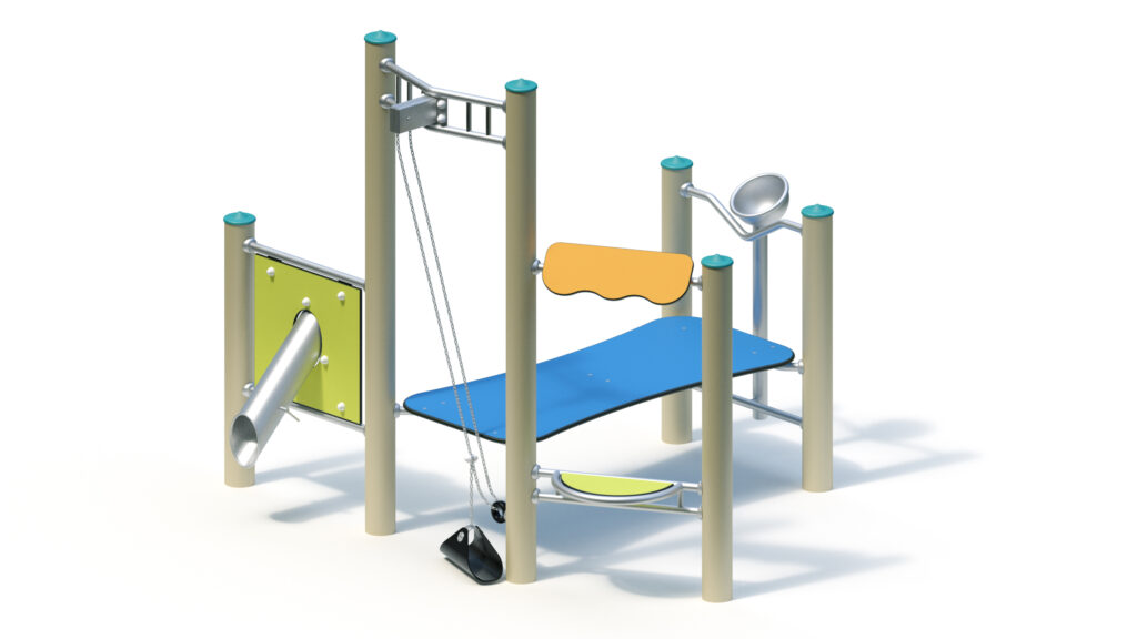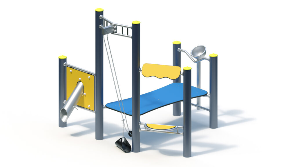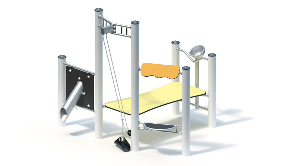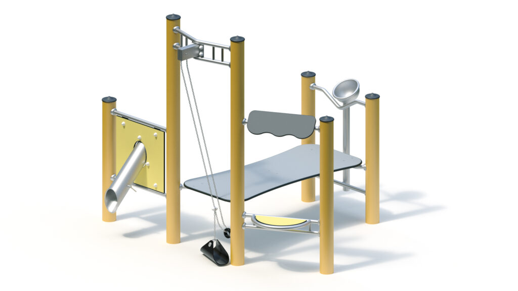 – infill panel from highly weather-resistant coloured HPL (yellow) with sand chute and shutter, fastening between stainless steel tubes Ø 33,7 x 2 mm