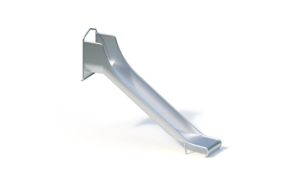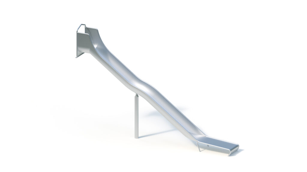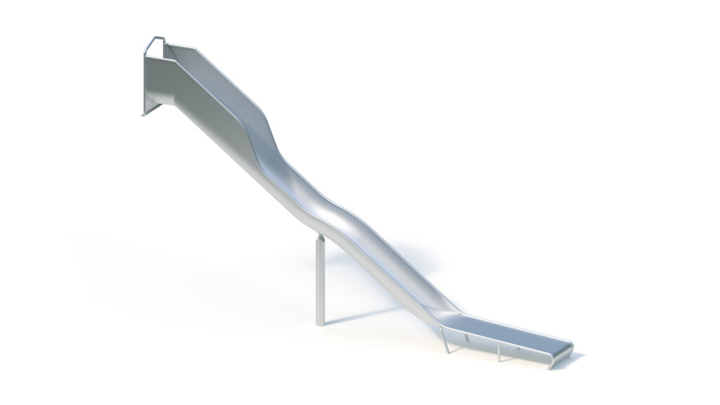 One-piece stainless steel structure with additional support for slide run-out section. Speed control by means of a waved section. Slide of low noise level thanks to trough-shaping. Slide installation either on a strip footing or another appropriate surface (wooden platform or planking) to be determined on site.