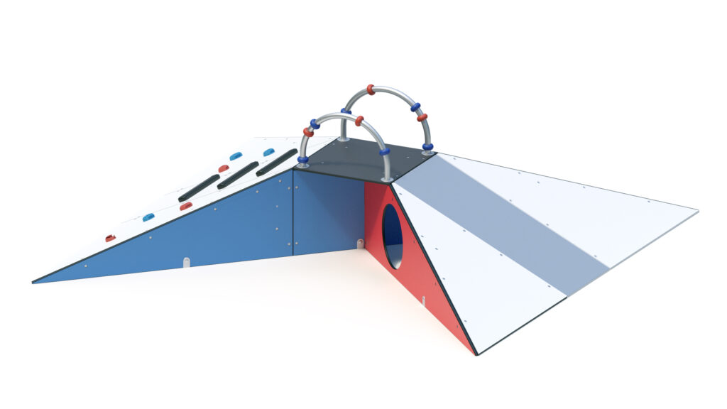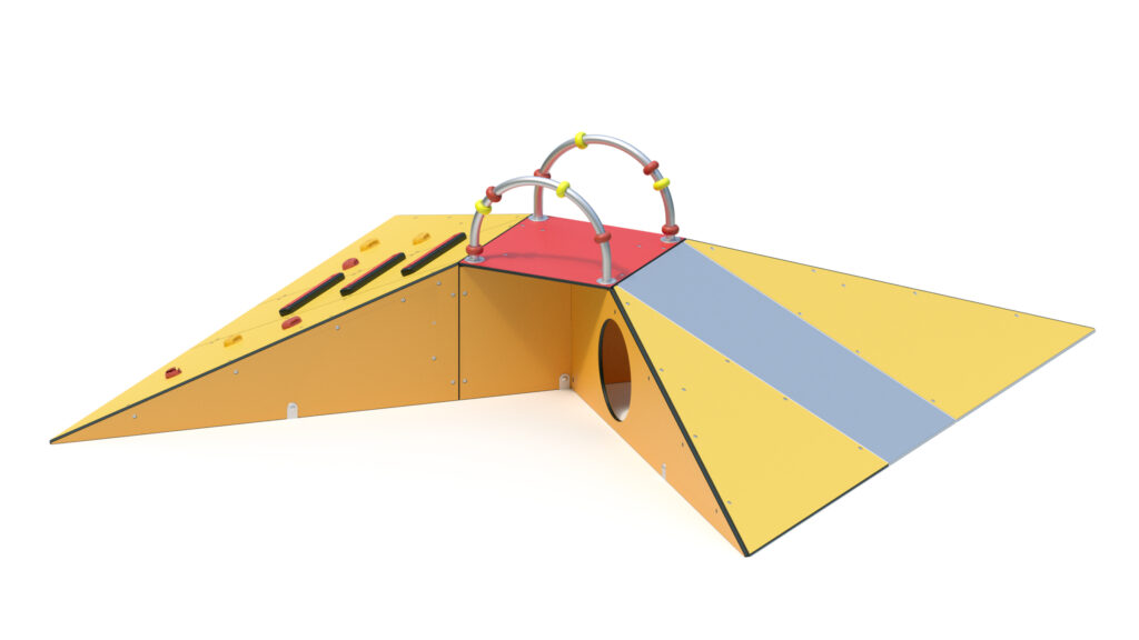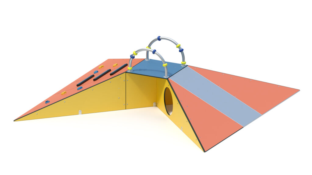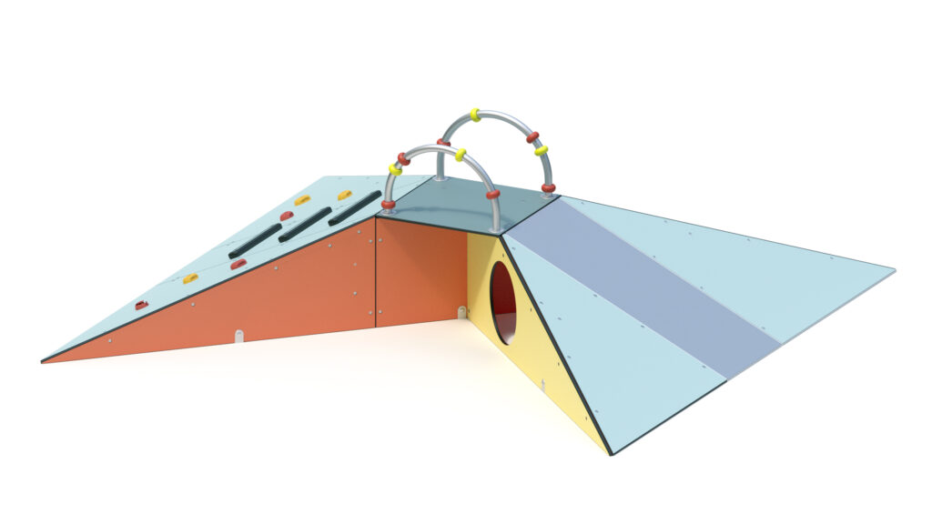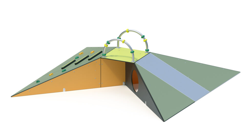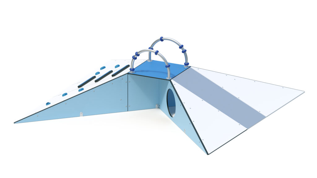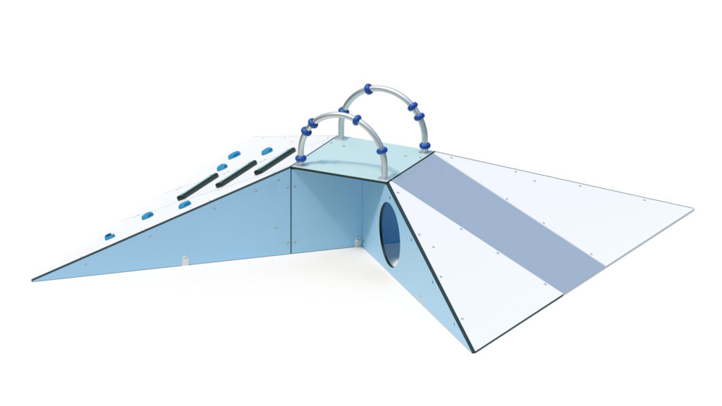 – Podestboden, Rampe, und Seitenplatten (teilweise mit Krabbelöffnung Ø 410 mm) aus farbigen, höchst witterungsbeständigen HPL-Schichtstoffplatten 10/13 mm.