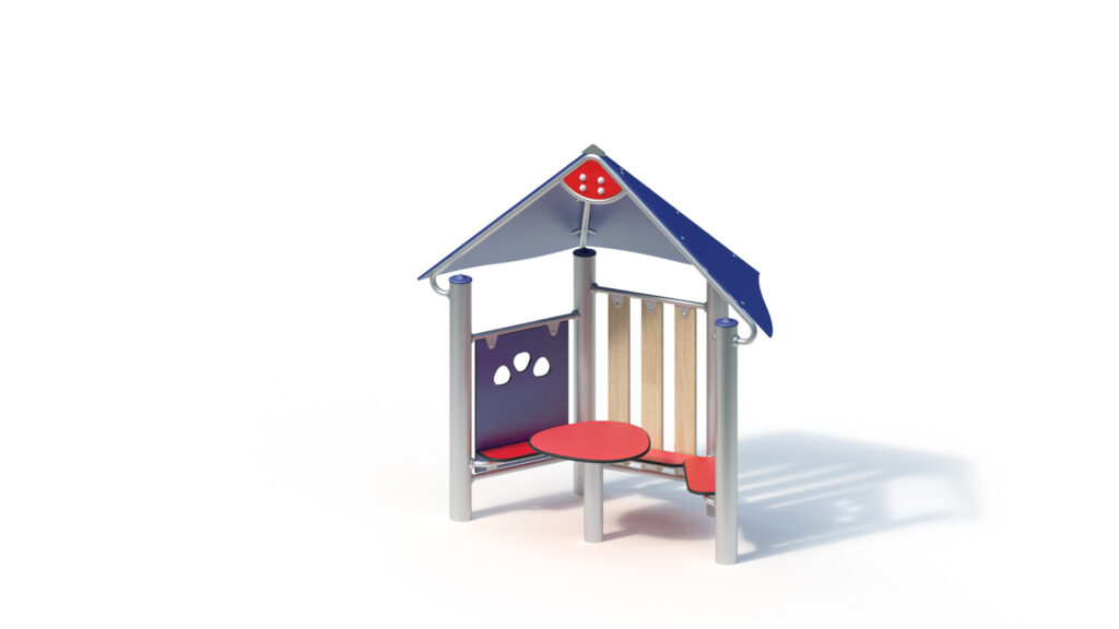 – Zeltdach, Neigung 45°, aus höchst witterungsbeständiger HPl-Schichtstoffplatte, 13 mm. Befestigung an Dachrahmen aus Edelstahlrohr Ø 33,7 x 2 mm